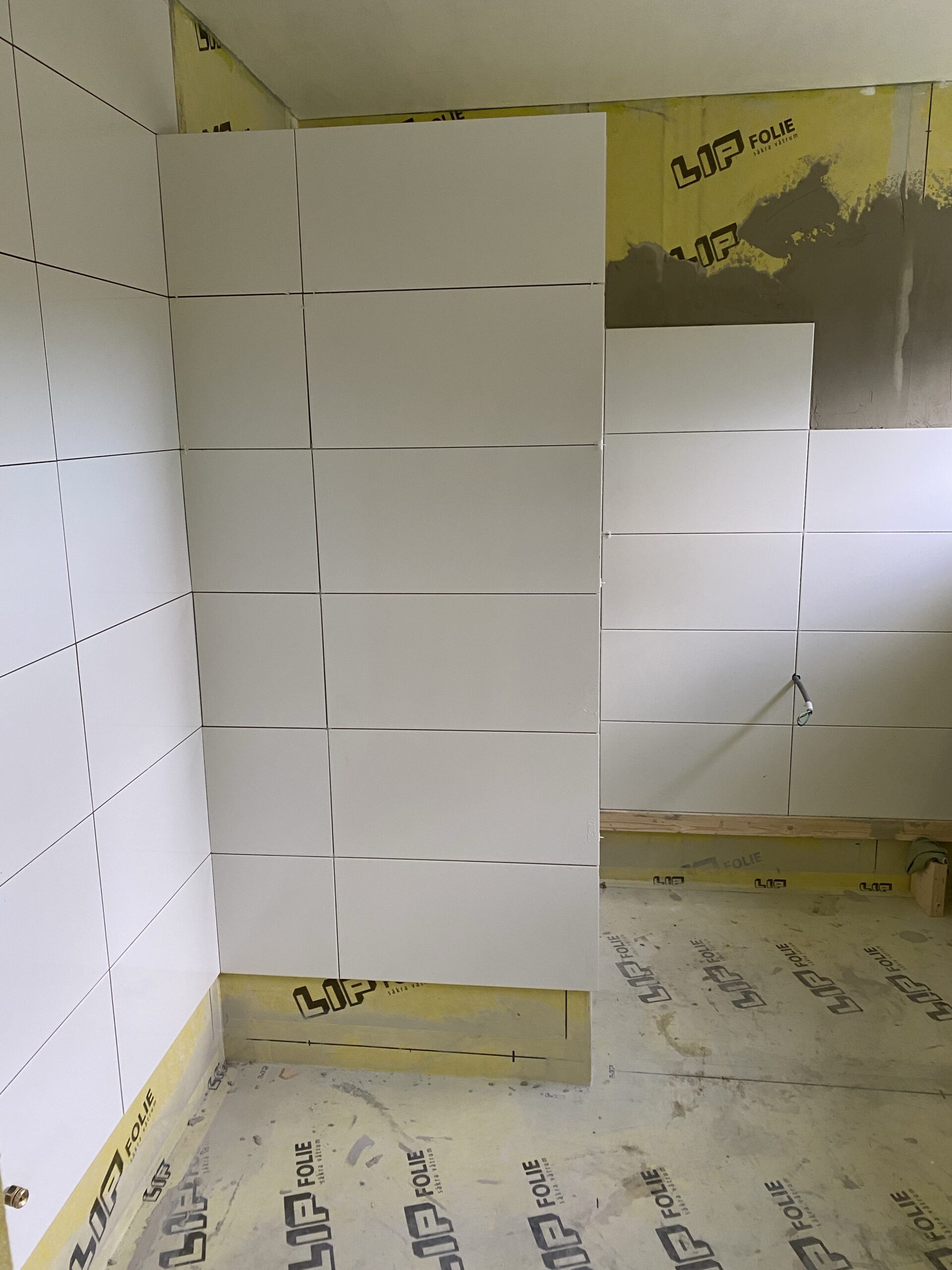 Kaklingen är påbörjad i badrummet.