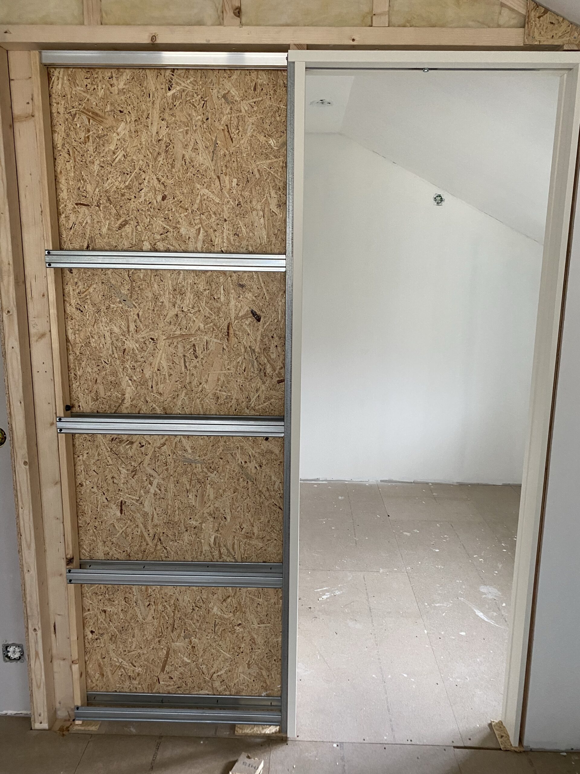 Tidigare i veckan kom våra dörrkarmar. Tyvärr blev det fel i beställningen och vi fick fel storlek på alla karmar utom den till skjutdörren. Den har monterats till klädkammaren. Själva dörrarna kommer i en senare leverans.