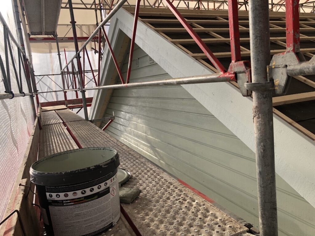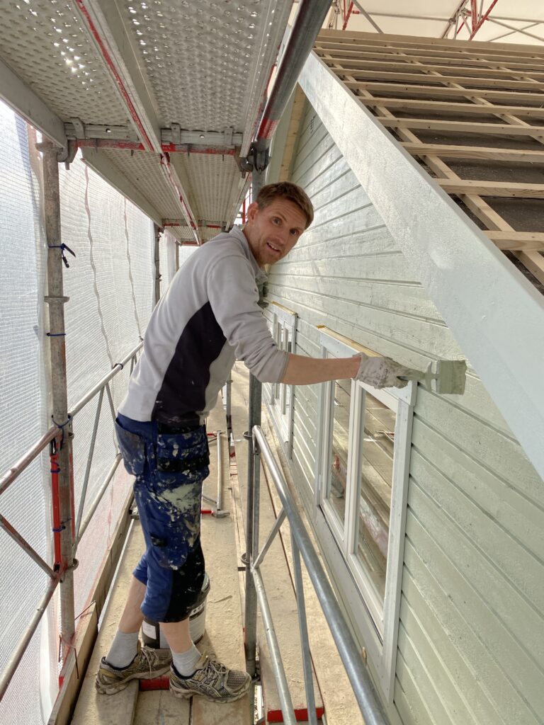 Måla måla måla. Mkt panel är det, närmare bestämt 1,8km! Helgens brädhög är klar och på em idag tog jag termometern till sydsidan och den visade 14 grader mellan tältduk och hus. Klart godkänd temp för målning så hann med 3/4 av en andra strykning på sydsidan. Snålblåst utanför men ställningen är stadig och trots att jag hänger ut mot taknocken känns det tryggt. Roligare var det också även om målarboden funkar fint den med. Snickarna har målat runt fönster och under taknock innan de satte upp fodret så enkelt för mig att bara mata på med strykningar på övriga delar! I veckan ska det bli ännu lite varmare så bör funka fint att fortsätta målandet tills ställningen försvinner.