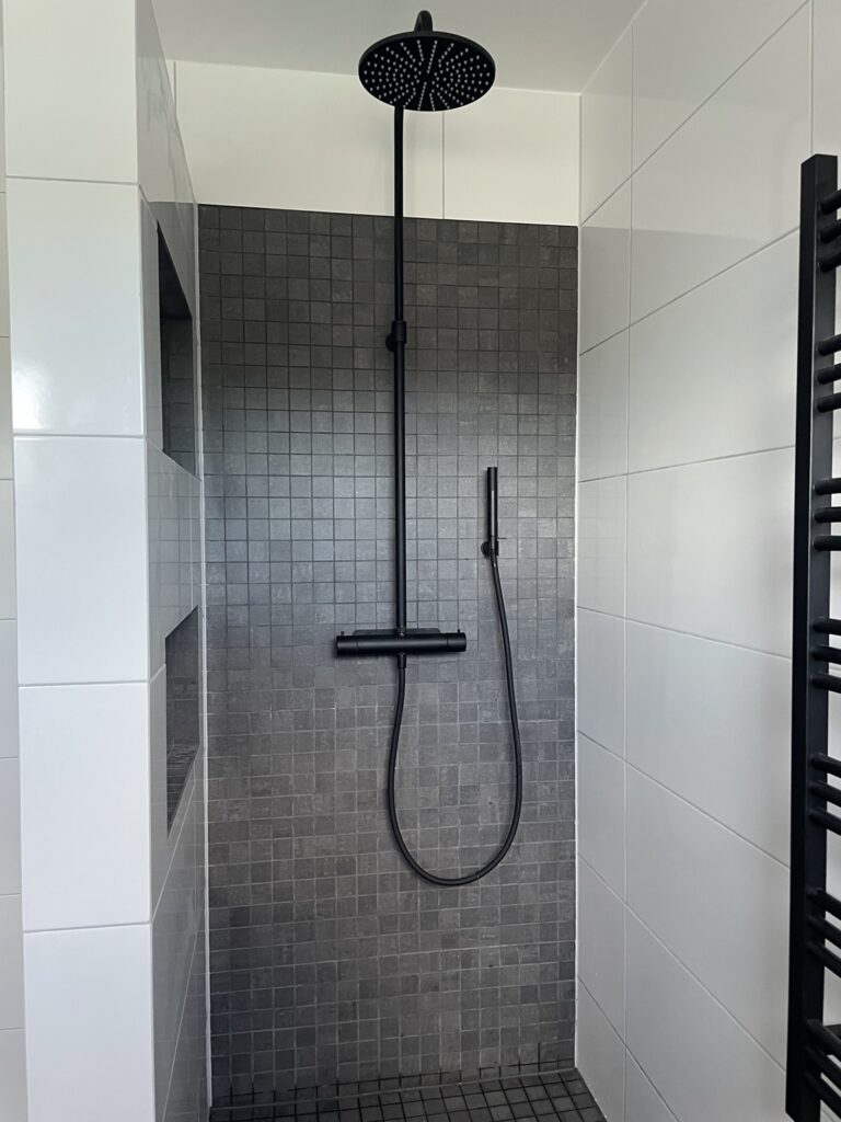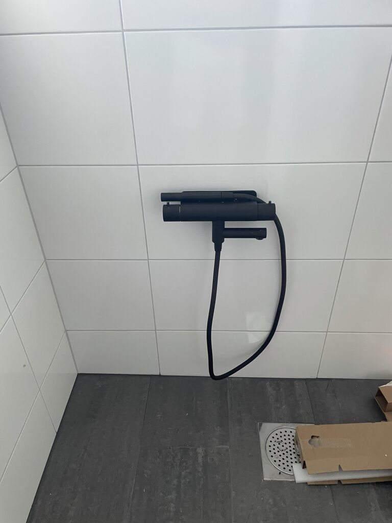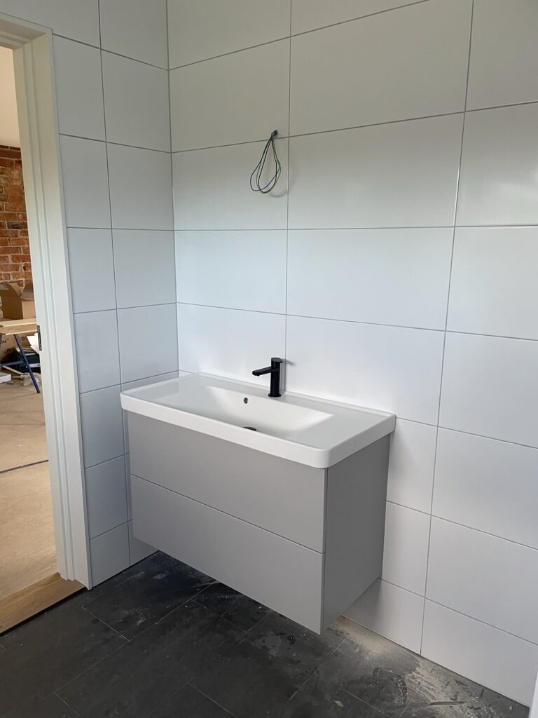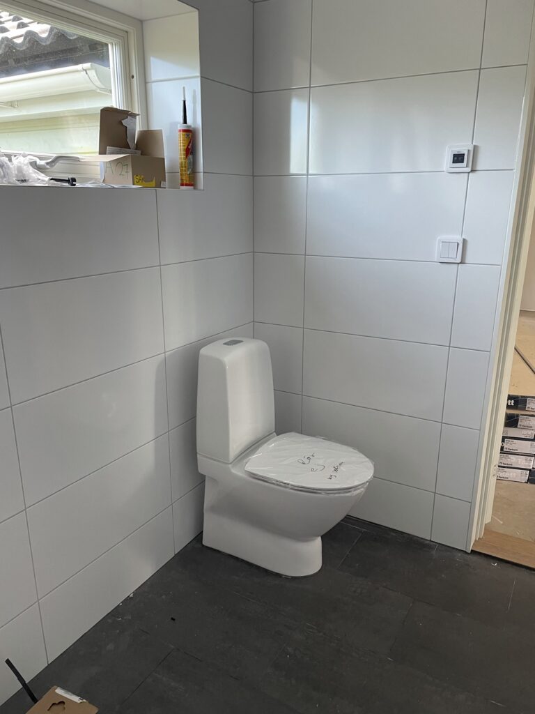 Igår var rörmokarna på plats och installerade badrumsinredning. Så nu har vi toalett, handfat och dusch i badrummet. Högskåp, hyllor och vår högteknologiska spegel (den får nog ett eget inlägg när den kommer upp) har ingen vattenanslutning och lämnades därför till snickarna.