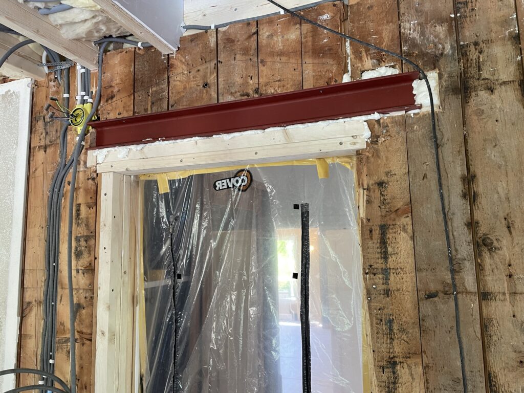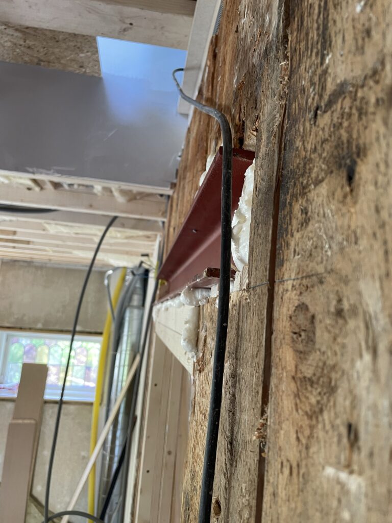 I gången från hallen till befintlig våning behövde vi enligt konstruktionsritningarna förstärka med en stålbalk. Den har legat i trädgården sedan i vintras men nu är de på plats. Tyvärr är den lite för bred så de sticker ut lite från väggen, får se hur vi kan lösa det på nåt snyggt sätt.