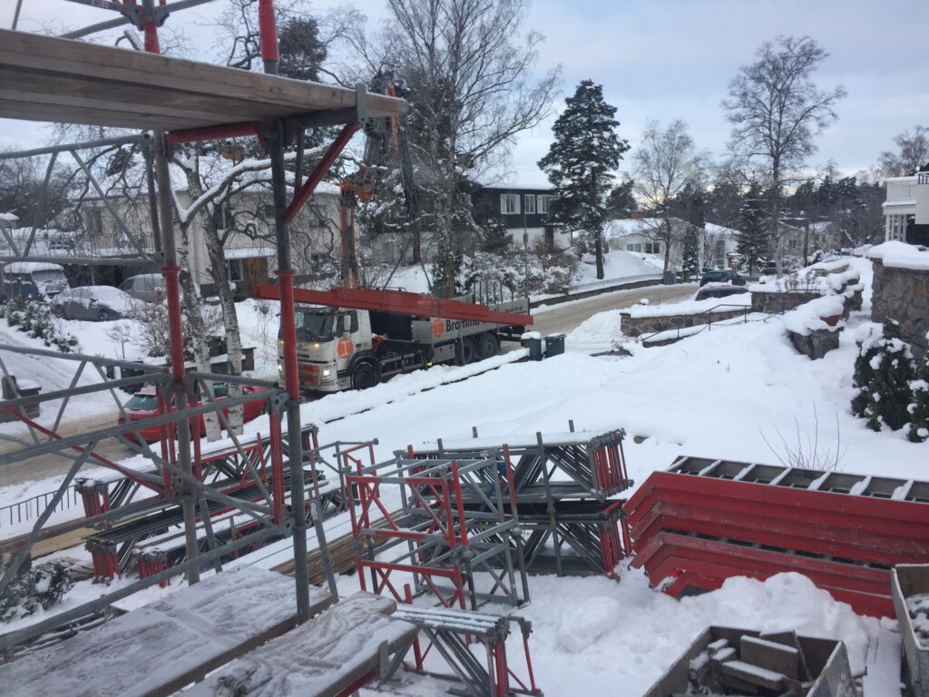 Idag blev också första dagen med snickarna. Kl 7 kom de in och började mäta och klura i vardagsrummet. Projektledarn instruerade och berättade om projektet. Och kl 8 kom balkarna! Den långa överliggande balken ser ut att komma in uppifrån trots allt vilket jag ser positivt på. Dock behövs det en lång kranarm för att få in den på vinden, de väger ju sjukt mkt. Men först täcka golv i vardagsrum och sen börja såga sönder och göra plats på vinden, knäcka teglet bredvid murstock och förhoppningsvis ta ytterpelarna utifrån innanför panelen innan vi lyfter in balken.