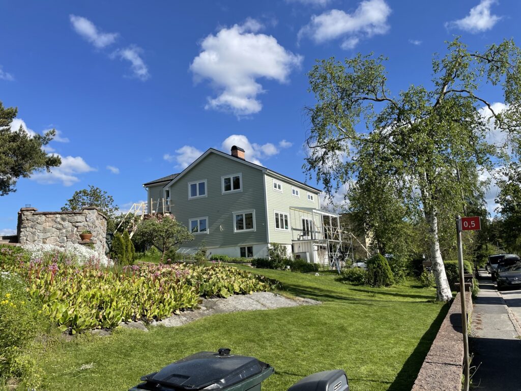 Idag har de fått upp stommen till balkongen på framsidan. Både jag och snickarna har även målat balkongdelar. All panel är nu grundmålad och nästan allt har fått en omgång grön strykning.