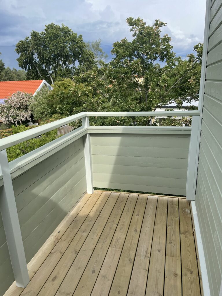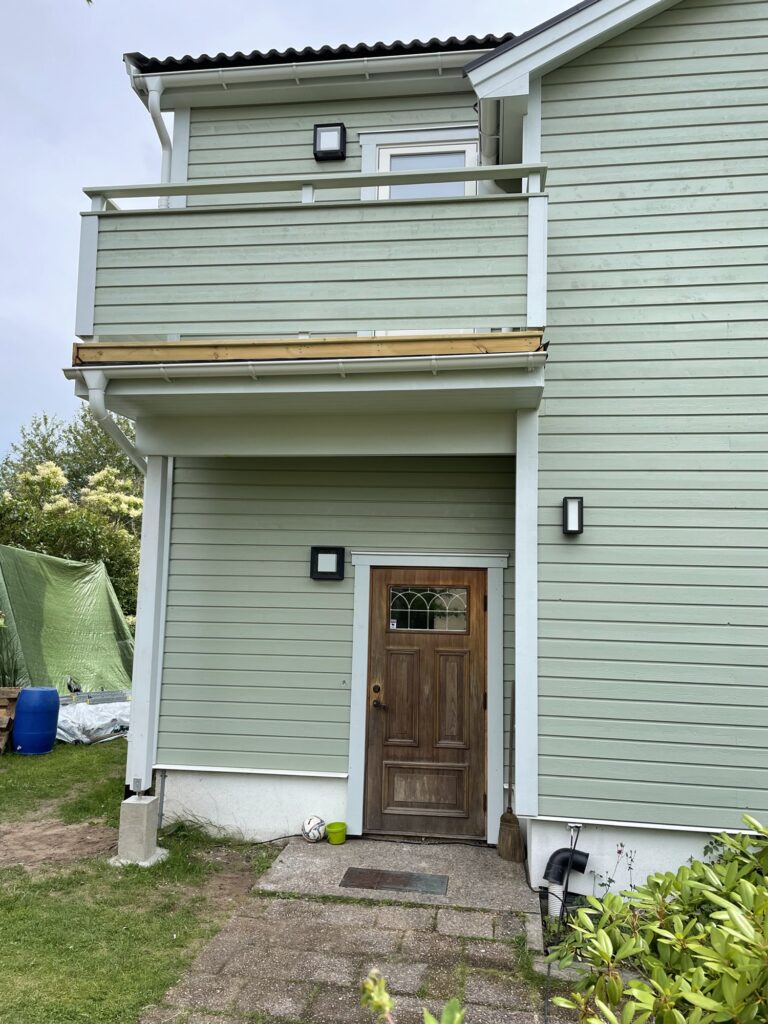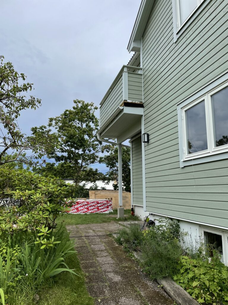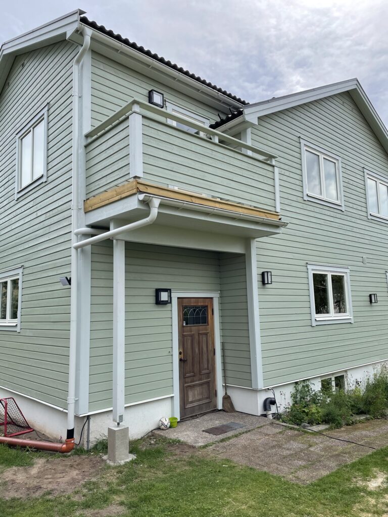 Balkongerna är klara och allt foder och räcken är på plats och målade. Nån enstaka förbättringsmålning ska till och trallvirket tar vi nästa år men annars är allt klart. Stuprören under nya balkongen är sammankopplade och stolpen gjuten. Blecket ovanför ytterdörren blev sne första gången men är nu rak.