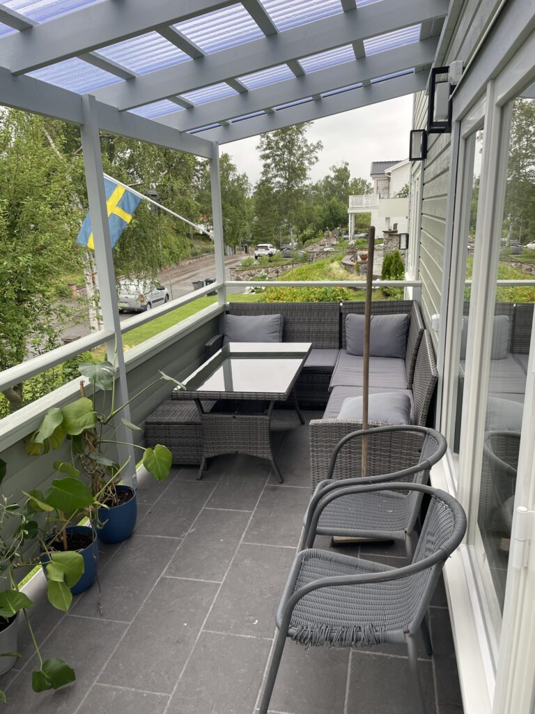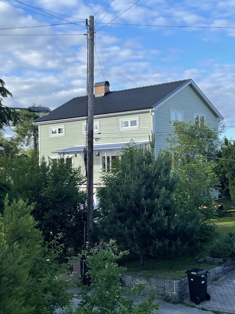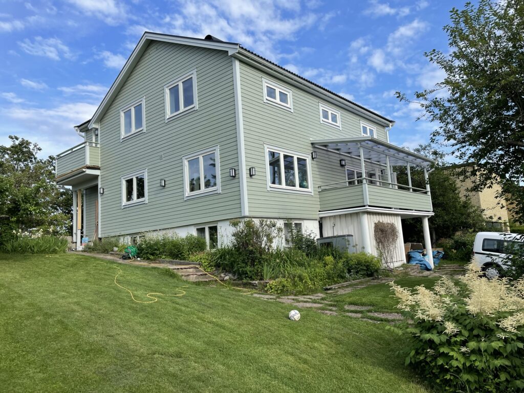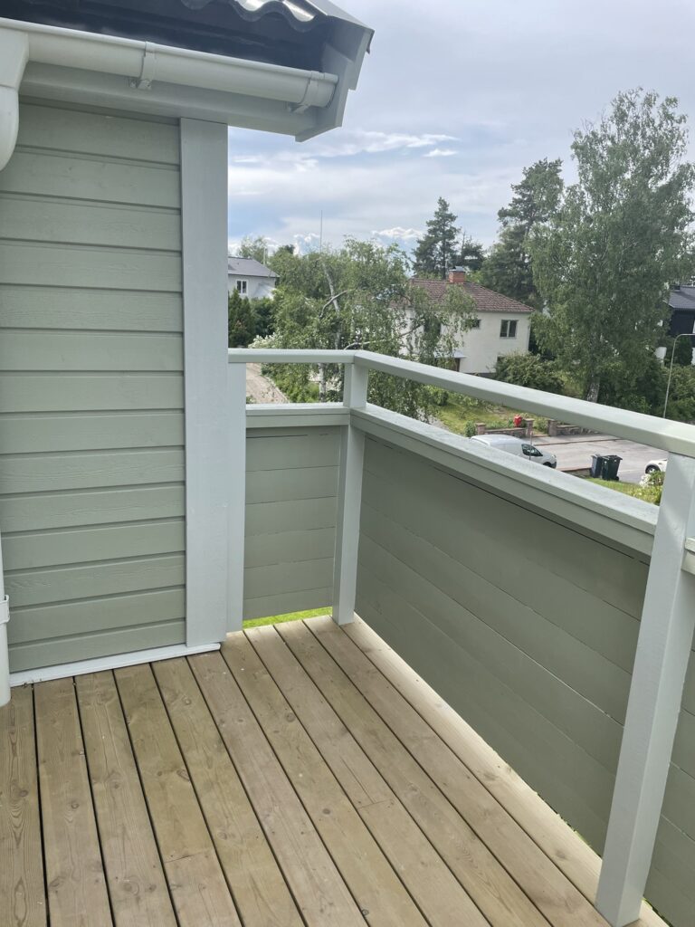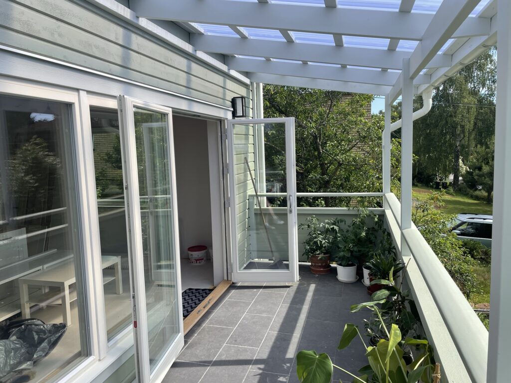 Balkongerna är klara och allt foder och räcken är på plats och målade. Nån enstaka förbättringsmålning ska till och trallvirket tar vi nästa år men annars är allt klart. Stuprören under nya balkongen är sammankopplade och stolpen gjuten. Blecket ovanför ytterdörren blev sne första gången men är nu rak.