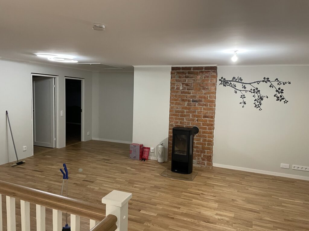 Slutbesiktning kräver det men det är ju även för egen del man vill ha bra brandsäkerhet. Så nu har vi monterat upp brandvarnare samt införskaffat brandsläckare, brandfilt och brandstege. Efter att fått ont i öronen samt kollat med larmbolaget kan vi konstatera att brandvarnarna fungerar som de ska.