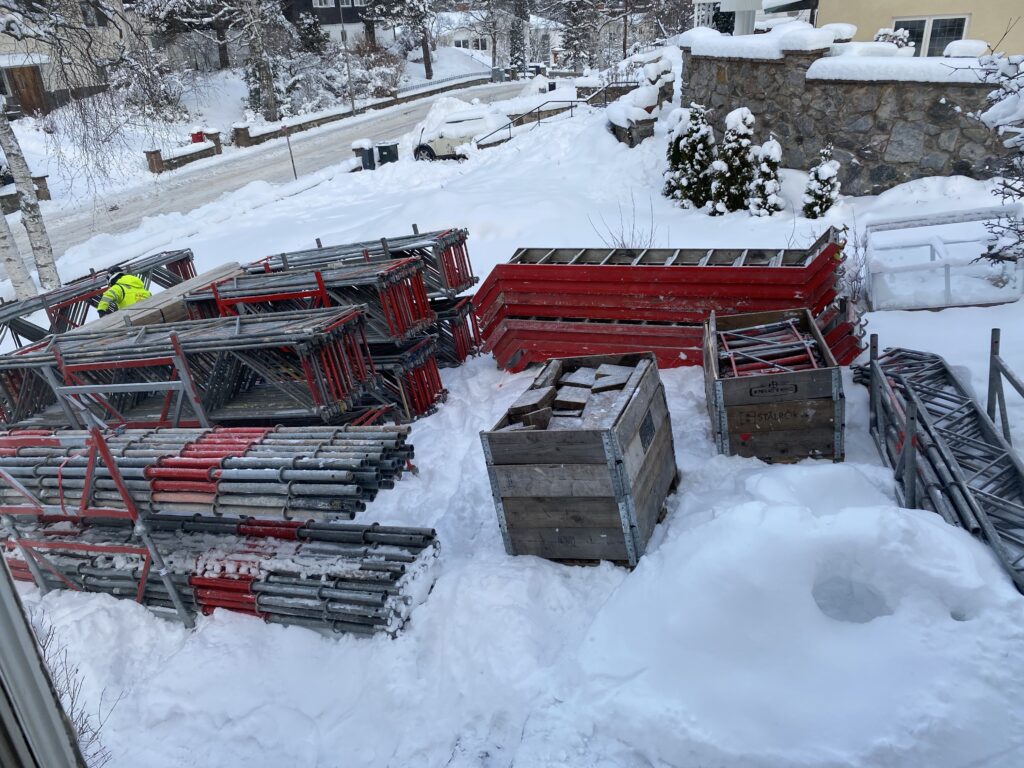 Idag skulle byggnadsställningarna börja sättas upp men eftersom det har snöat så mycket de senast dagarna hörde de av sig i förväg och sa att de skulle bli försenade – det skulle ta tid att plocka ner ställningarna från den tidigare byggplatsen. Nu är iaf tomten fylld med material.