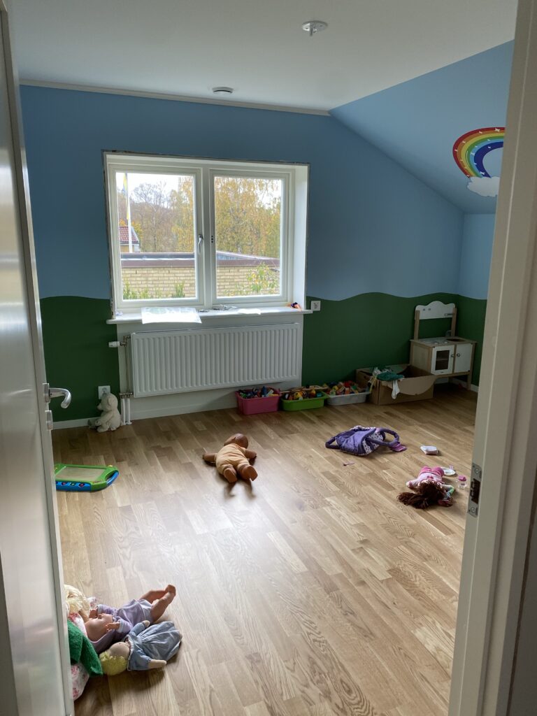 Det känns bra med allt extra utrymme och på sikt kommer barnen vilja ha egna rum men fram tills nu har det varit perfekt att ha alla samlade nära och vi känner ingen jättestress att flytta upp. Men vilken dag som helst ska vi flytta upp.