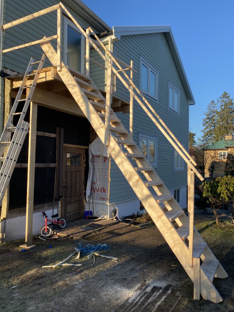Byggjobbarna tar ytterväggen in till nya våningen. Efter att byggställningarna försvann har vi istället haft en stege på plats. För att göra den mer stabil och för att minimera risken att någon snor den (för att tex använda vid inbrott) fäste ventilationskillarna den med metallband i balkongen. Men våra snickare ville ha nåt stabilare och byggde ihop det här.