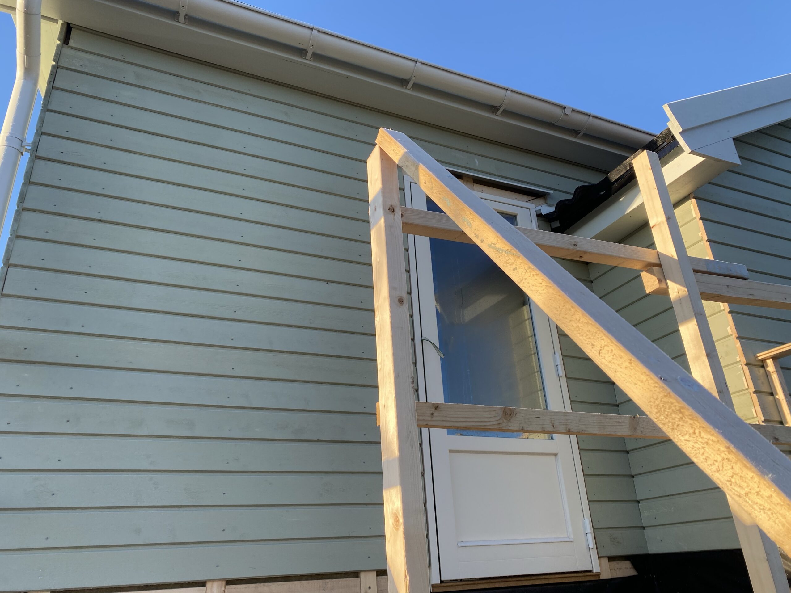 Så jag antar att vi avvaktar lite med att ta upp hål i halltaket för att bygga trappa. Balkongen har även fått fasadbrädor och ett provisoriskt räcke.