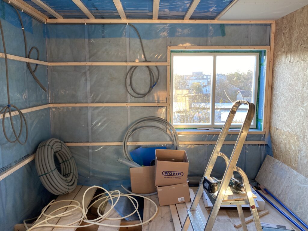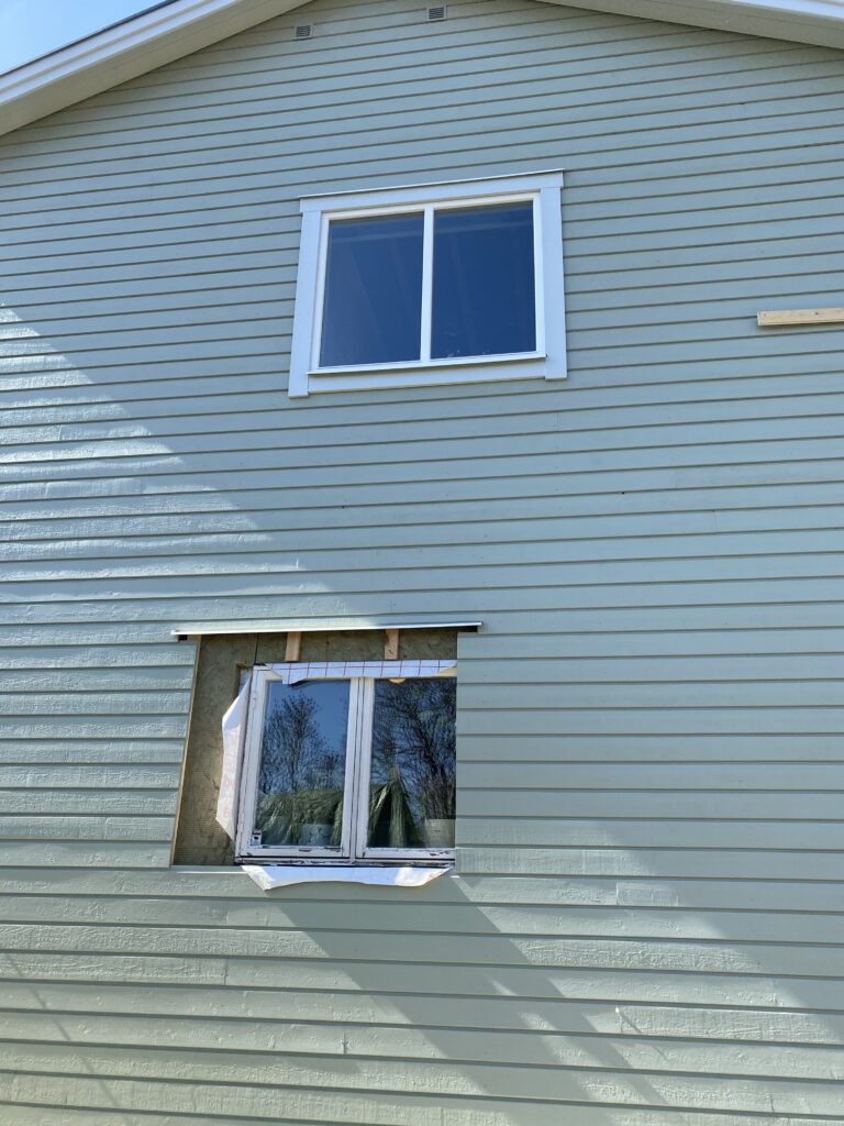Nu ser det istället ut som att det är intryckt i väggen. Att ha det placerat mitt på innerväggen skulle se bättre ut och dessutom ge bättre ljusinsläpp i allrummet. Så vi har bestämt att det ska flyttas. Tråkigt att behöva göra om men bättre nu än när innerväggarna är färdiga. Och det här är annars nåt vi skulle störa oss på. Utifrån sett kommer fönstren ändå inte att vara i linje. (Det nedre fönstret har ännu inte bytts ut mot nytt fönster)
