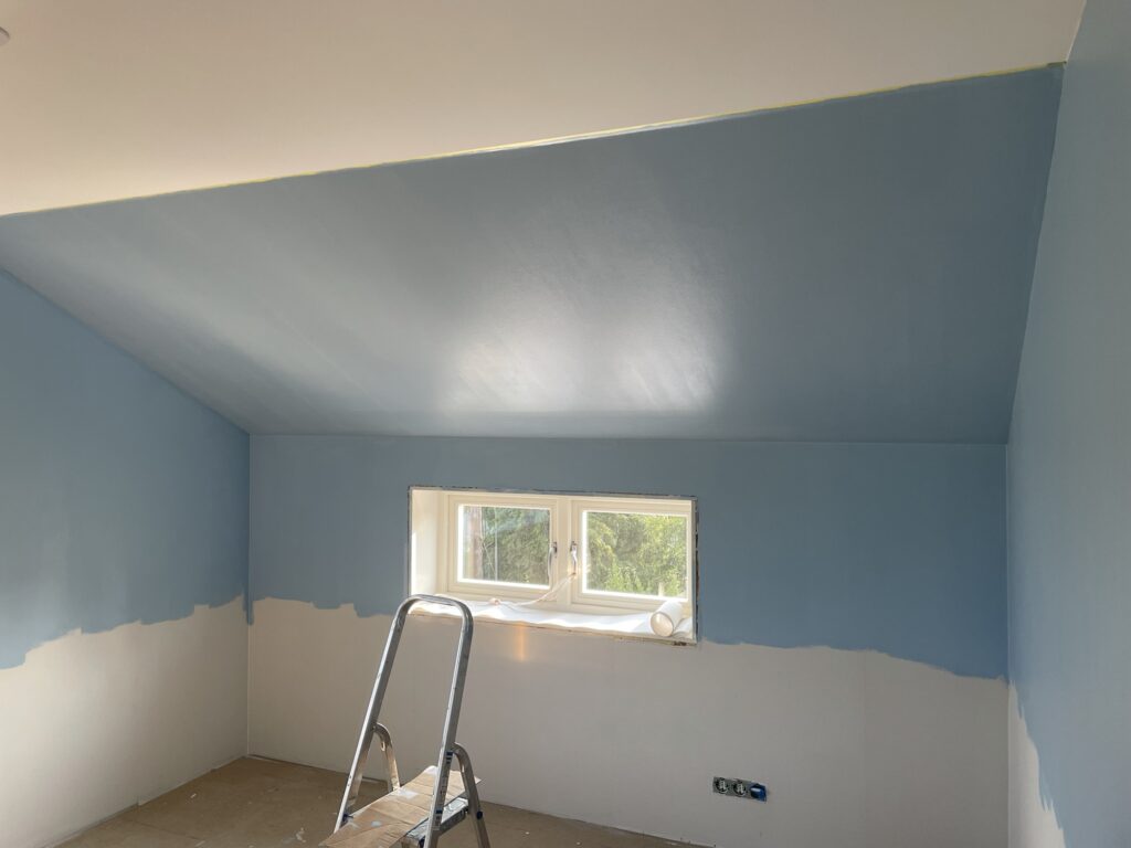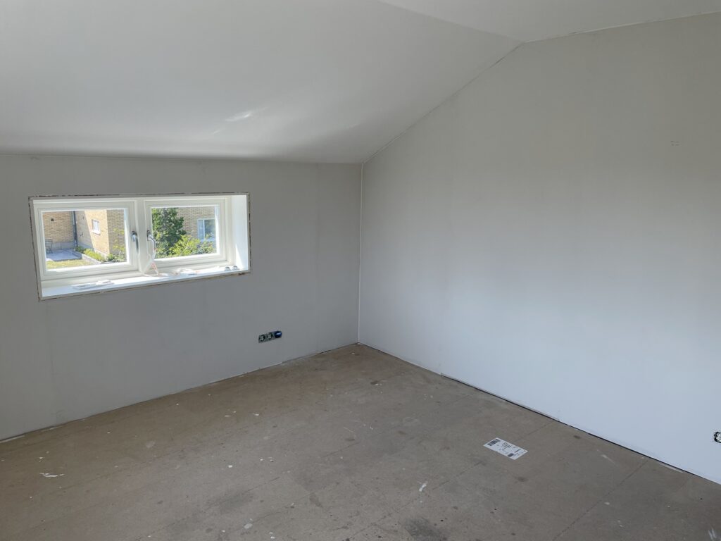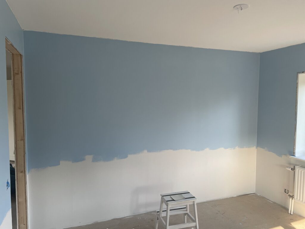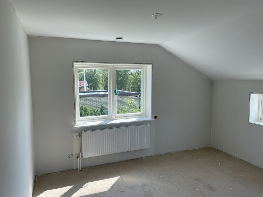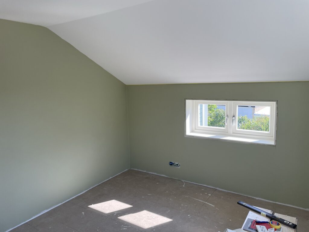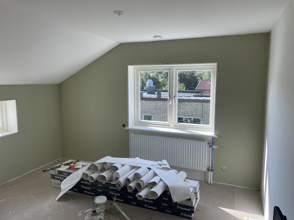 Sen målade vi barnens sovrum och lekrummet omvartannat två ggr. Kryddgrönt i barnens sovrum och himmelsblå överst (och sedan Oregano som gräs nere) i lekrummet.