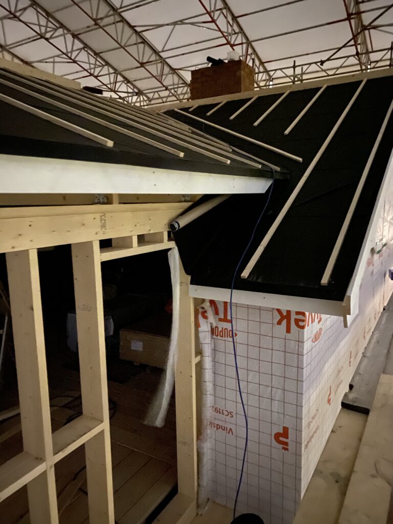 Som vanligt tog vi ett varv uppe på bygget när byggarna gått för dagen. Nu är det vindpapp och isolering på nästan hela övre plan. Taket är pappat och idag har de satt på läkt. För att få överblick på bygget räcker det inte längre att gå upp en våning på byggnadsställningarna. Jag har inte vågat mig upp högre än två och där vågar jag inte gå runt huset. Tredje våningen där man tittar ner på taket har jag aldrig vågat mig på.