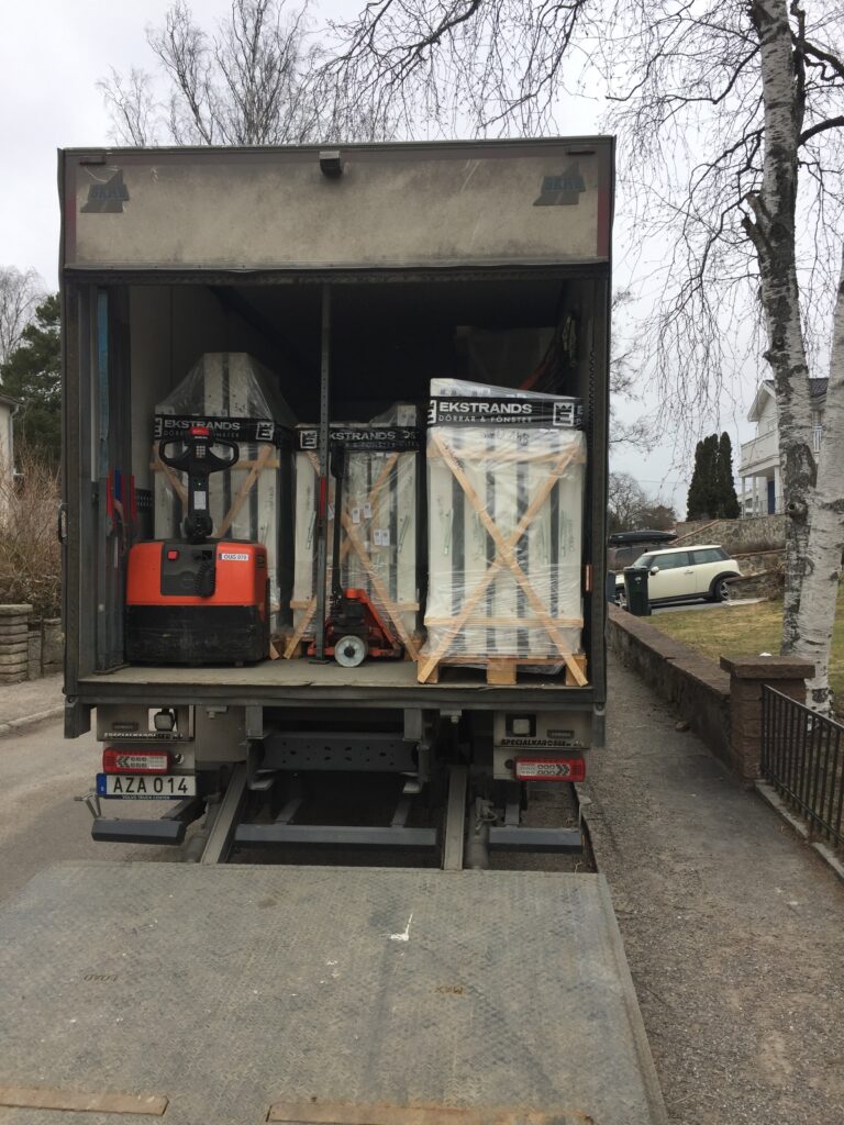 Idag levererades fönstren. Fyra pallar med fönster och balkongdörrar som nu står under en pressning på gräsmattan i väntan på att sättas på plats. Vi har bara några få dagar att rapportera ev fel och skador så det bästa vore om byggarna kunde börja med fönstren omgående. Känns som att vi riskerar att skada dem själva om vi ska packa upp, flytta runt och gå igenom allt ute i trädgården.