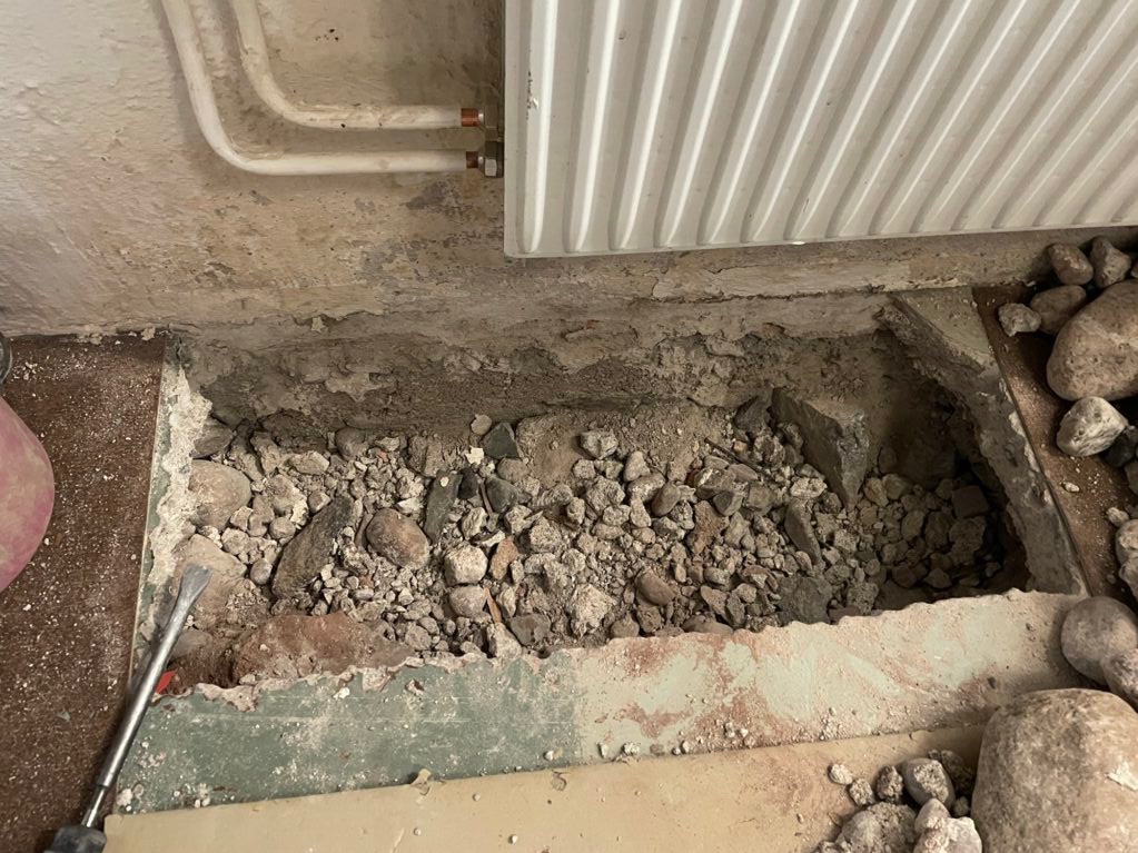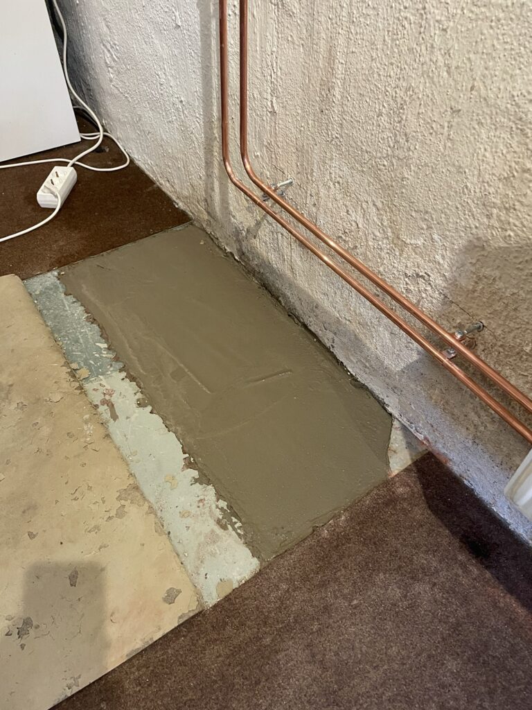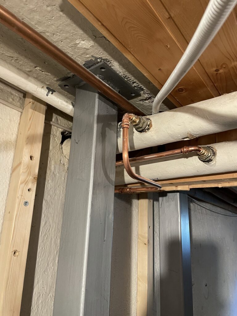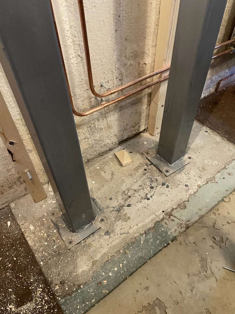 Då pelarlinjen inte träffade innerväggarna i källaren (se tidigare inlägg) så tyckte KA och konstruktör att det behövdes förstärkas. Snickarna tyckte nog att det skulle hålla ändå men för att vara på säkra sidan och inte få några överraskningar om 10-20 år med sättningar i huset så behövde vi förstärka pelarlinjen. Konstruktören ville veta armering och betongkvalitén i bjälklaget men för att veta det skulle man ju behöva göra hål i densamma med resultatet att det försvagas. Så snickarna föreslog en lösning med två pelare i källaren som konstruktionsfirman godkände. Pelarna fick precis plats mellan vattenledningarna så det ”enda” som behövdes var att flytta ett element några dm i sidled. När rörmokarna fixade termostaterna häromdagen så fixade de även detta.