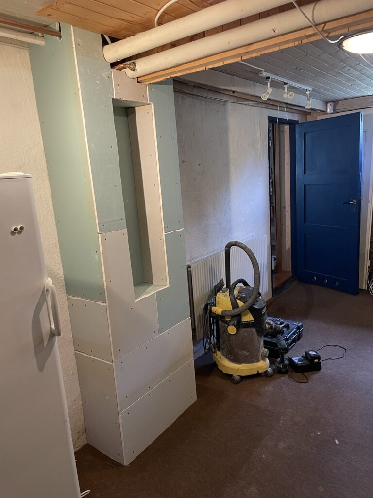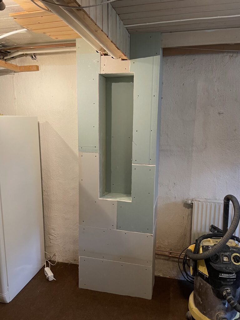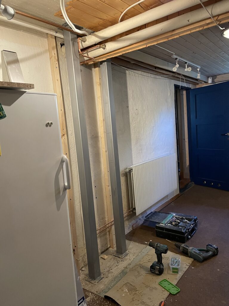 Under golvet var det dock inte mkt som höll emot. Snickarna bilade upp, plockade bort x antal hinkar med sten och grus och fyllde hålet med betong. sen knacka dit pelarna. Idag målades de med rostskydd innan de byggdes in. Vi knäckte då idén om att nyttja så mkt utrymme som möjligt så här blir det nu nån form av hylla. Spackling får bli vid senare tillfälle. Visst hade vi hellre haft en slät vägg kvar men känns ändå bra att få en lösning på plats.
