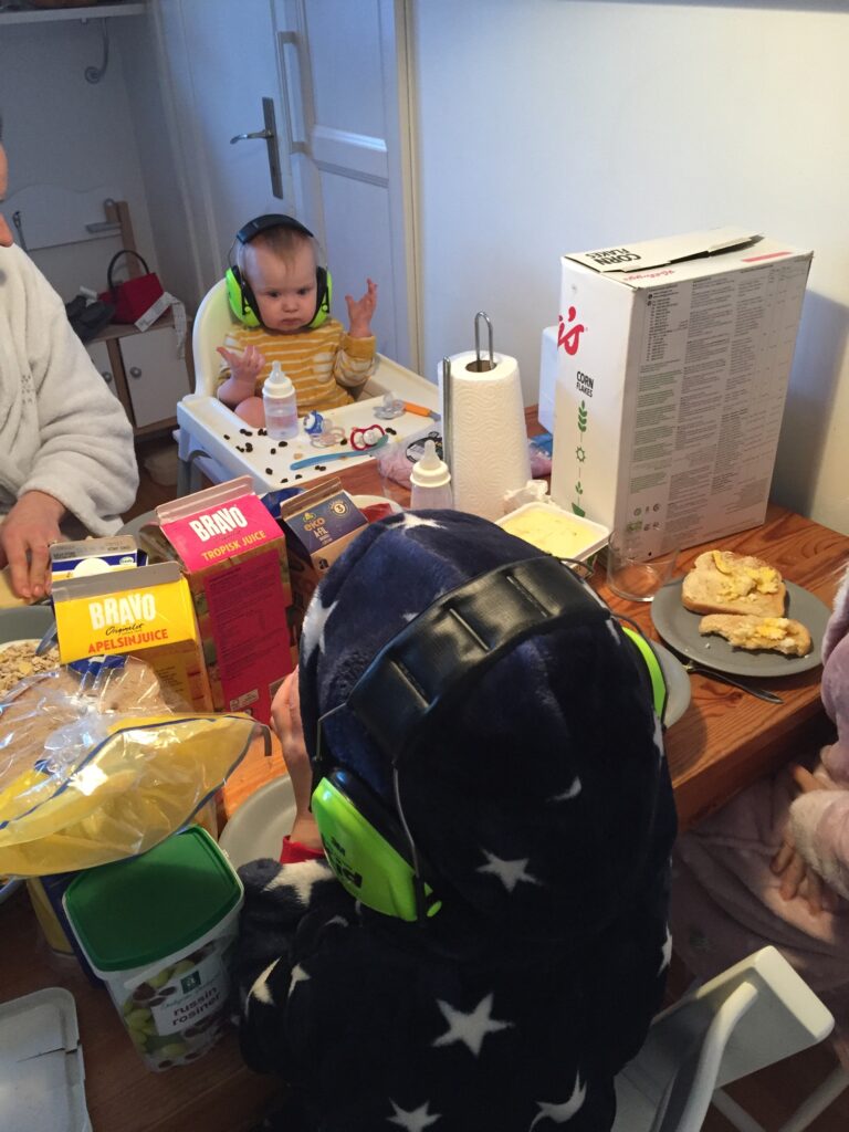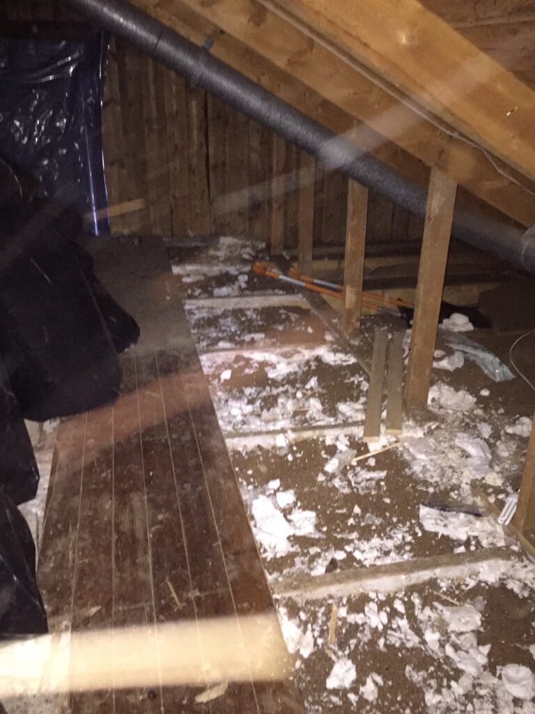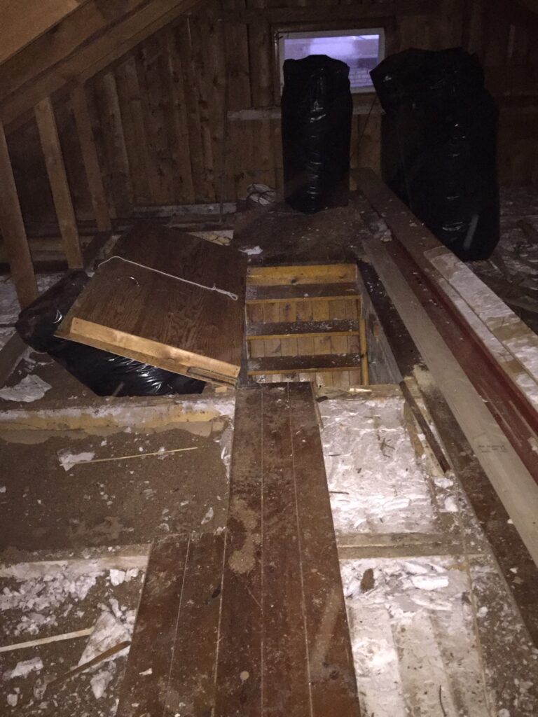 Rivningen av vinden fortsätter. Det blev frukost med hörselkåpor idag. Byggarna kom kl 7 och fortsatte med vindsröjningen. Nu är staketet runt ”hålet” borta och de flesta golvbrädor så försiktighet krävs när man tar sig fram på vinden. Containern #3 är full, men vi kan fylla säckar med spån!