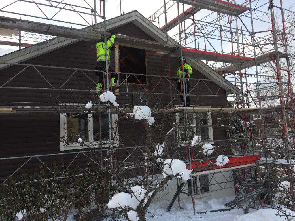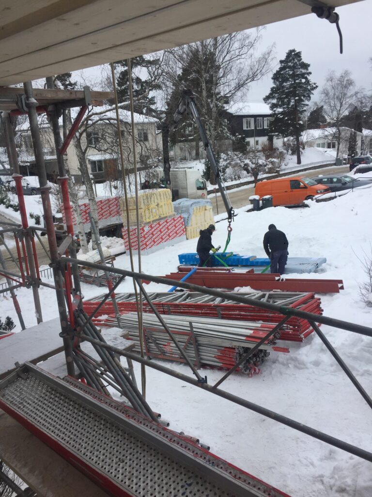 Materialet levereras med extra lång kranarm för att i samma veva lyfta in 7-metersbalken. Snickarna har gjort ett hål i väggen till vinden och ställningarna tillfälligt pausats på denna sidan.