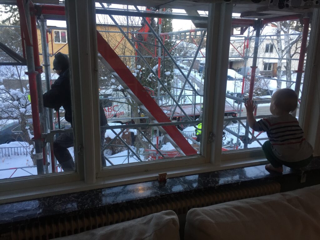 Första byggjobbare kommer vid 6:30 och Veronika börjar morgonen med att låsa upp ”byggboden” och tillser att det finns kaffe mm där nere innan hon ger sig ut på sin morgonjogg. Kl 7 sätter alla bygglag igång och det går gubbar på spängerna utanför fönstret. Linnéa är nyfiken. Oskar sitter och kollar på ”Bygga hus” på tvn istället… 🙄
