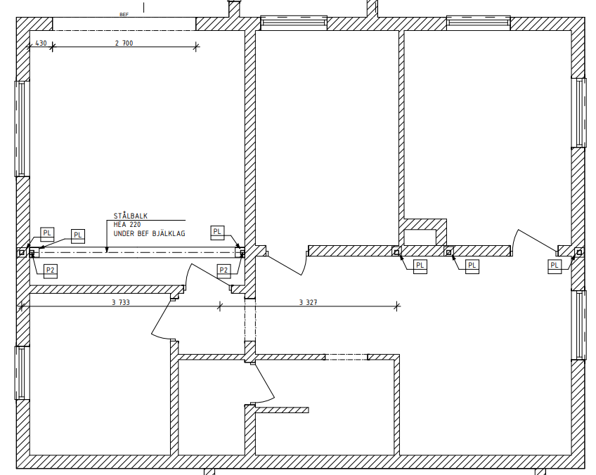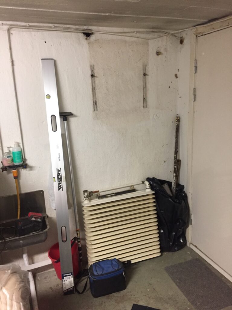 Utmaningen just nu är att få pelarna rätt som ska hålla upp balkarna som den nya våningen ska byggas på. Pelarlinjen i entréplan följer en innervägg i källaren centralt i huset och förlängs med pelare och balk i garaget. Vid närmare mätning visar det sig att den linjen ligger närmare innerväggen i garaget. Varken arkitekt eller konstruktör har varit här och mätt utan friskriver sig hela vägen till snickaren att mätning måste göras på plats. Förståelse på ett sätt då mått i gamla hus sällan stämmer på ritning men samtidigt ger ju mer korrekthet från början möjlighet till bästa möjliga lösning i slutänden. Nu visar det sig att pelaren hamnar mitt för elementet i garaget. Blev att ringa in rörmokaren och ta bort elementet (till frusna ställningsbyggarna förtret). Fortfarande tvåsiffrig plustemp där inne iaf.