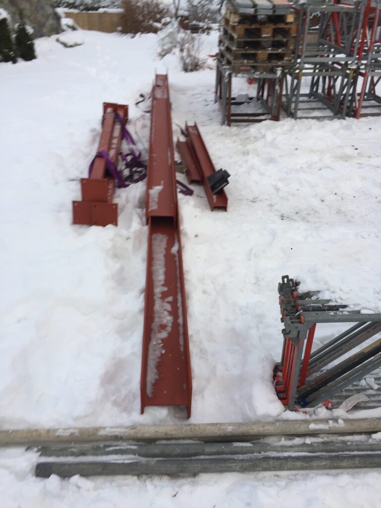 Vid närmare granskning inser jag nu också att balken i taket är en rejäl feting, 22cm tjock! Och den ska under ett redan lågt tak. Lätt att missa tredje dimensionen när ritningar är i 2D. Lite tur dock att garagegolvets lägsta punkt är i detta hörn pga golvbrunn men kommer bli tajt med mina 191cm att komma under. Balken ska kläs in i brandskyddat material också… (och skumgummi kanske 😂) och dörren in till garaget är definitivt körd. Får kapa den i överkant eller öppna den åt andra hållet, vilket inget är önskvärt. Men hellre lite krångligt i garaget än en pelare mitt i golvet i vardagsrummet ovan.