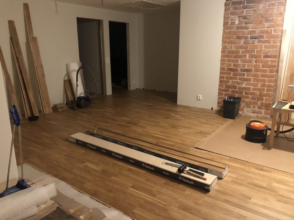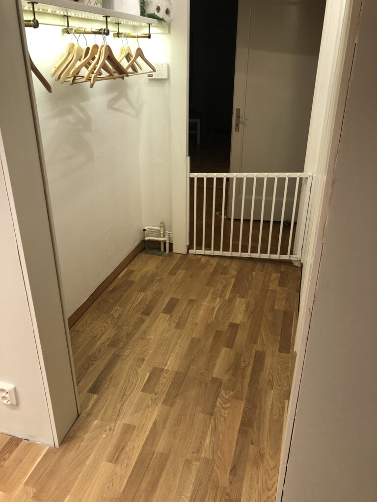Snickaren har nu fixat golvknarret så jag och Urve fortsatte att lägga golv idag. Så nu fick vi klart barnens sovrum och nästan hela allrummet. Under dagen har också snickaren lagt golv i hallen så nu är det bara en liten bit närmast trappen kvar i allrummet att lägga. Vilket lyft det blir när golvet kommer på plats!
