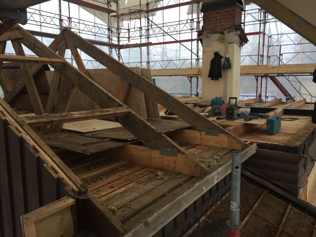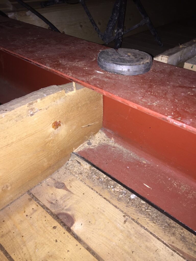Nu förbereds golvbjälkar. Gamla bjälklaget har de på ena sidan av balken fasat ur och lyckats få in i ”H-et”. Nya bjälklaget används ihop med gamla vilket gör att vi kan behålla råsponten som just nu är det enda som skiljer vår boendeyta från byggarbetsplatsen.