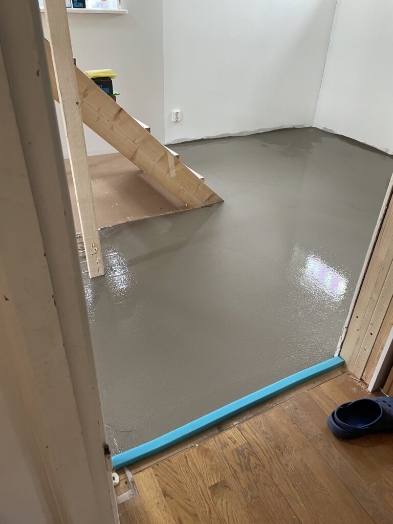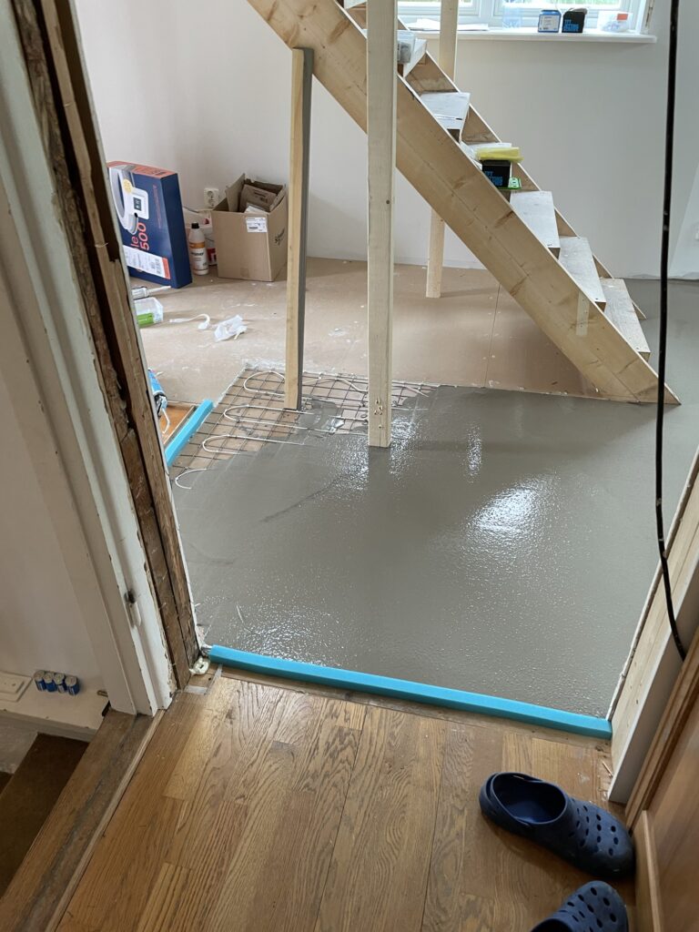 I hallen funderade vi länge på hur vi skulle göra med uppvärmningen. Precis innanför dörren där vi har en liten yta av klinkers finns redan golvvärme och den behåller vi. Men de andra två elementen har vi demonterat då det ena är i vägen för trappan och det andra tog vi bort för att kunna få till förvaring. Vi fick en offert på vattenburen golvvärme men den drog iväg rejält i pris, och den är också trögare och lite svårare att trimma in. Elvärmen är snabbare att få värme i och kan även köras en regnig varm sommardag. Så vi kör på elvärme i golvet (som vi förhoppningsvis i framtiden kan driva av vår egen solel).