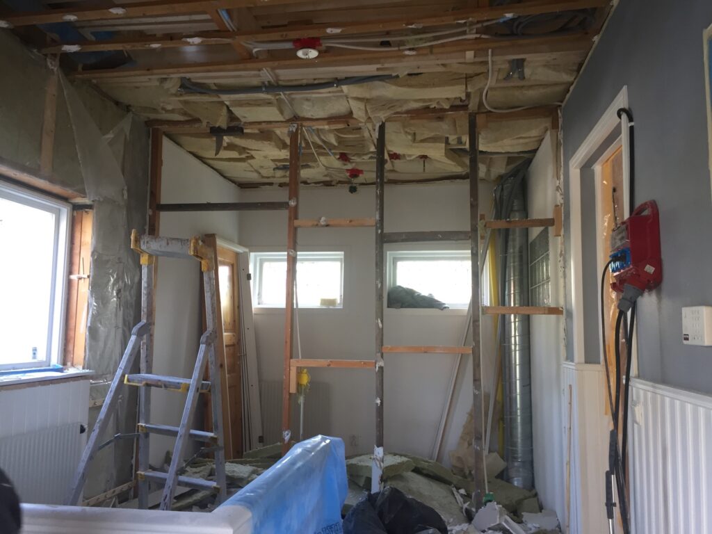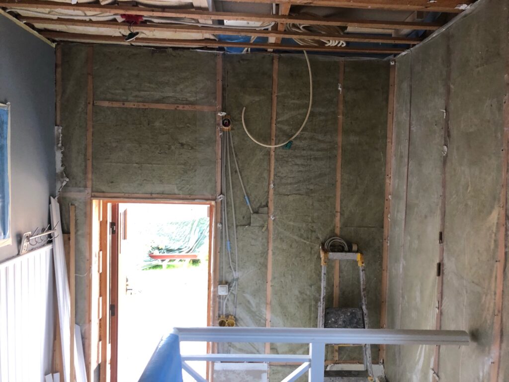De var fyra man idag så i övrigt så har de fortsatt spackla och slipa på nya våningen och nu är nästan alla innerväggar och tak klara däruppe förutom i trappdelen. Jag skriver nästan för det tar längre tid än man tror och det är många kvadrat och hörn som ska spacklas och slipas. Men de har en rejäl slipmaskin som gör jobbet lättar iaf. Väggen runt fönsterflytten är nu också på g att få isolering, innervägg och gips men antar att de väntar tills hålet är öppet och de kan matcha med väggen nedan. Väggen nedan som dessutom är lite sned som vi skrivit om tidigare. Flytten av fönstret blev iaf kanon och jag är glad att vi tog det beslutet.