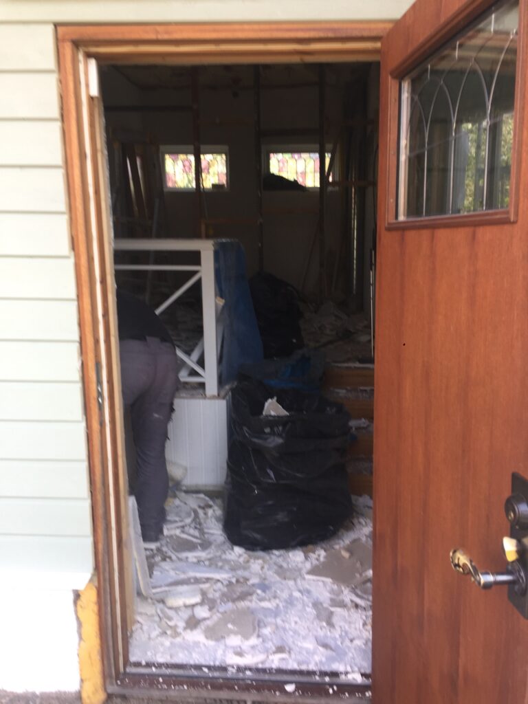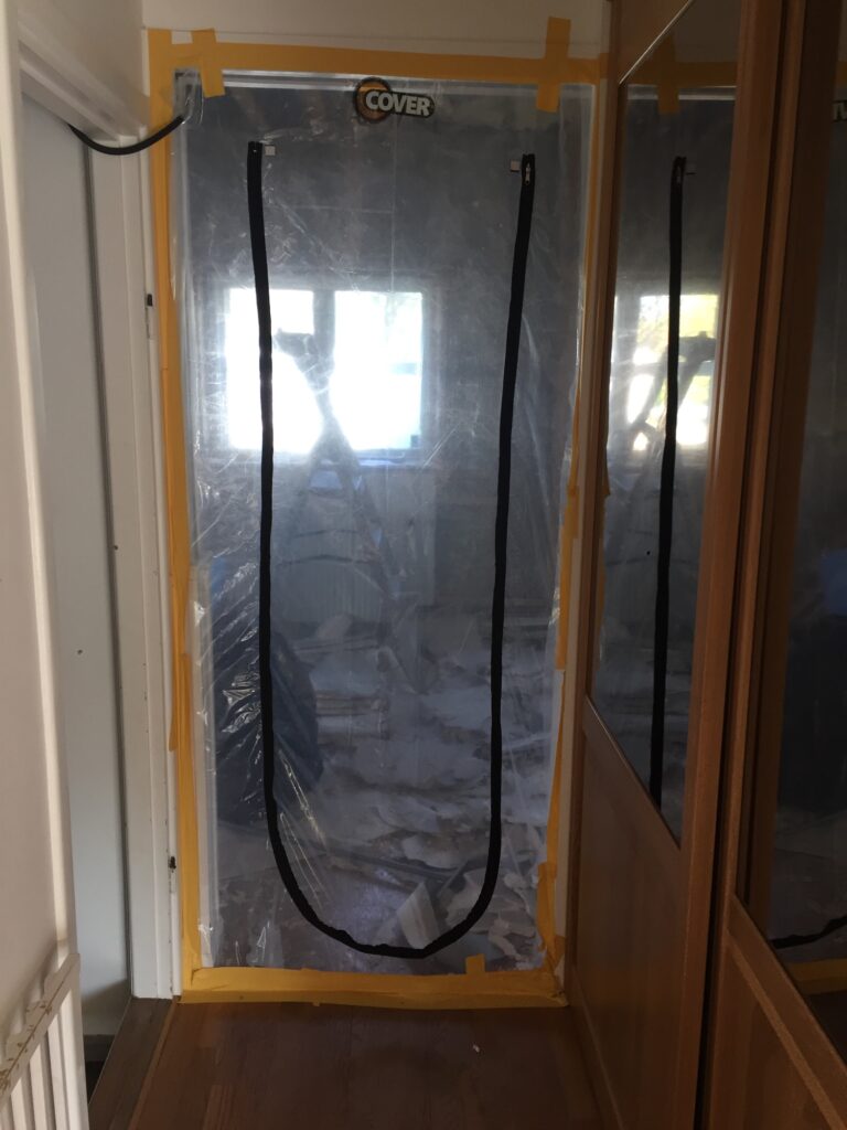 Idag kom de så igång med att riva hallen och ta upp hålet. De plastade igen gången till övriga huset och det öppna ”innerfönstret” till källartrappen och kunde sedan demolera gips och väggar. Jag och Lisa var förbi en sväng idag så fick tillfälle att fota lite. Det kommer bli riktigt fint att få fram våra blyinfattade fönster och härligt att få en större hall! Är peppad och förväntansfull på resultatet även om det är stökigt just nu utan en vettig entré till huset.