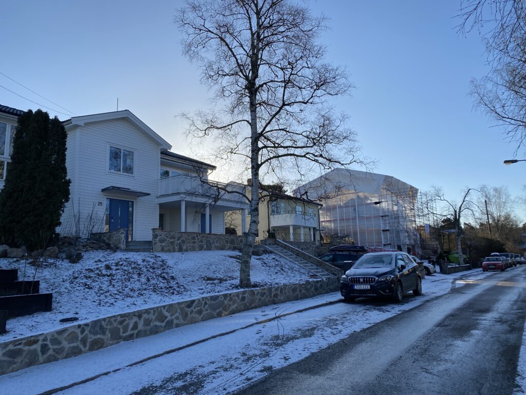 Imorse när jag kom hem efter att ha följt Lisa till skolan sken solen så att man såg konturerna av huset genom vindskyddet och kunde ana hur det kommer att bli. Tror inte att det kommer att kännas alltför högt ändå. Vi får faktiskt bygga högre, men vi vill själva inte att huset ska sticka upp för mycket och har därför valt att bygga med ett väggliv på 1,6 m istället för full takhöjd hela vägen ut.