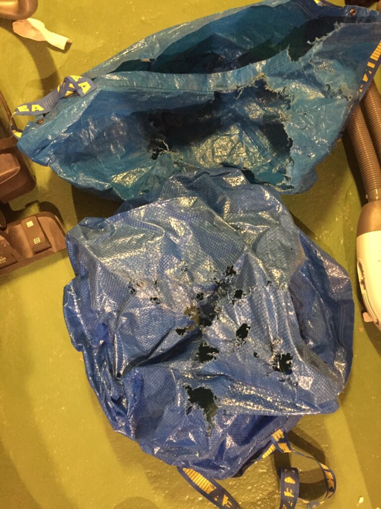 Gick ner i tvättstugan och nåt prasslade bland tvättpåsarna. Inget maskineri igång, inte Linnéa som gömt sig. Slutsatsen att nåt oönskat tagit sig in, tänk råtta! Vi har ett hål i golvet efter strulet med avlopp och inkommande vatten som vi lagt en skiva över. Jag hämtade snickarna för att vara flera som kunde hjälpas åt att jaga fatt på eländet. Men när vi kom tillbaka var den borta, men bevis fanns att nåt varit där. Nu har snickarna tejpat igen hålet så vi inte får mer besök tills avloppet är fixat.