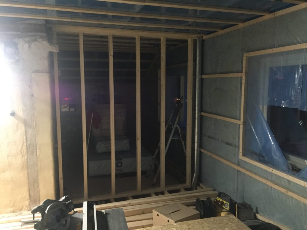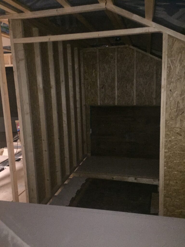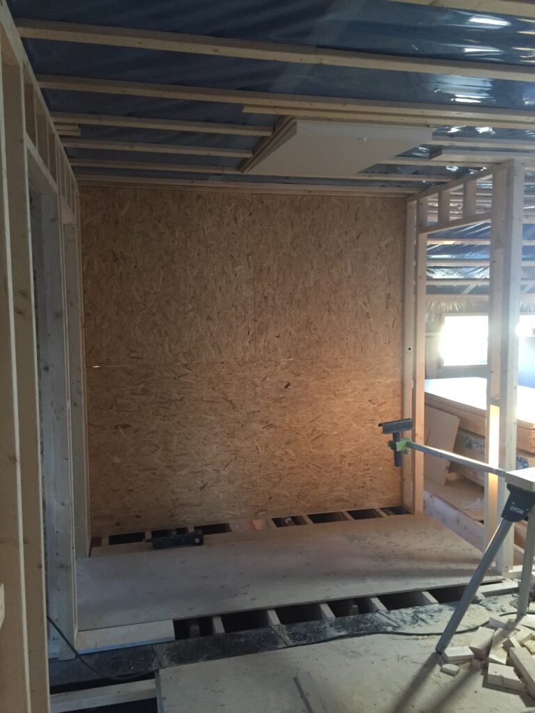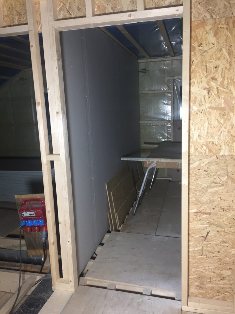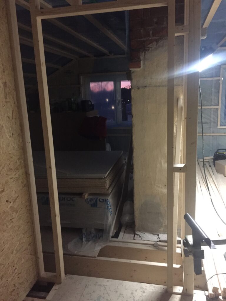 Igår när vi var uppe fick vi känslan av att ingången till stora sovrummet kändes lite tight mellan garderoben och skorstenen. Tog ett snack med snickarna som nu har flyttat garderobsväggen 40cm. Det blev mkt bättre! Skjutdörren blir något mindre men det gör inget, snarare positivt. Hellre flytta nu än när vi gipsat som snickarn sa 😀