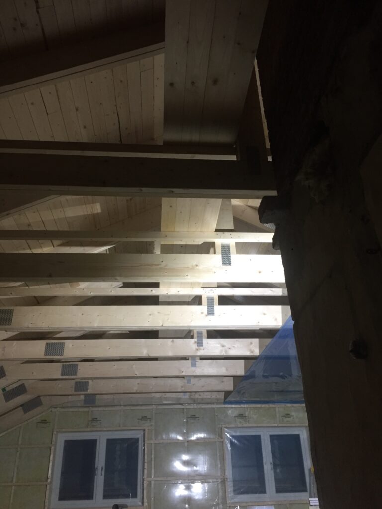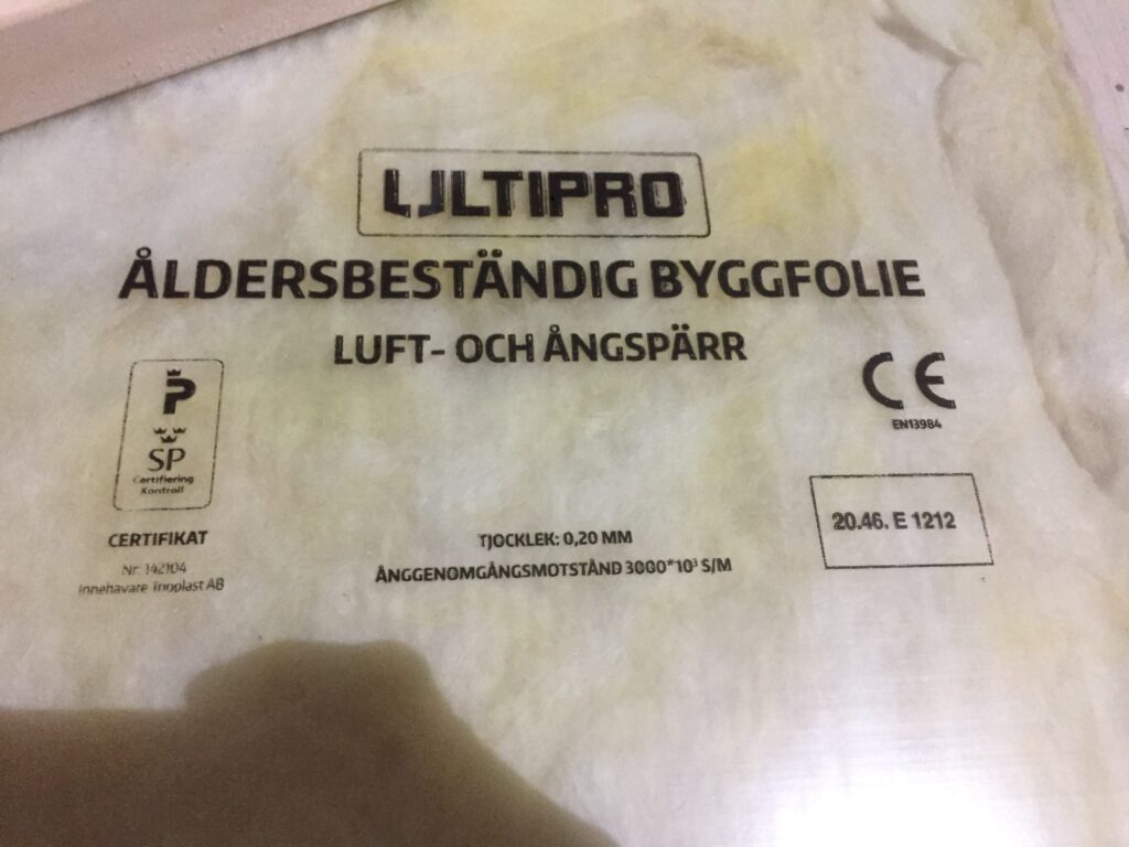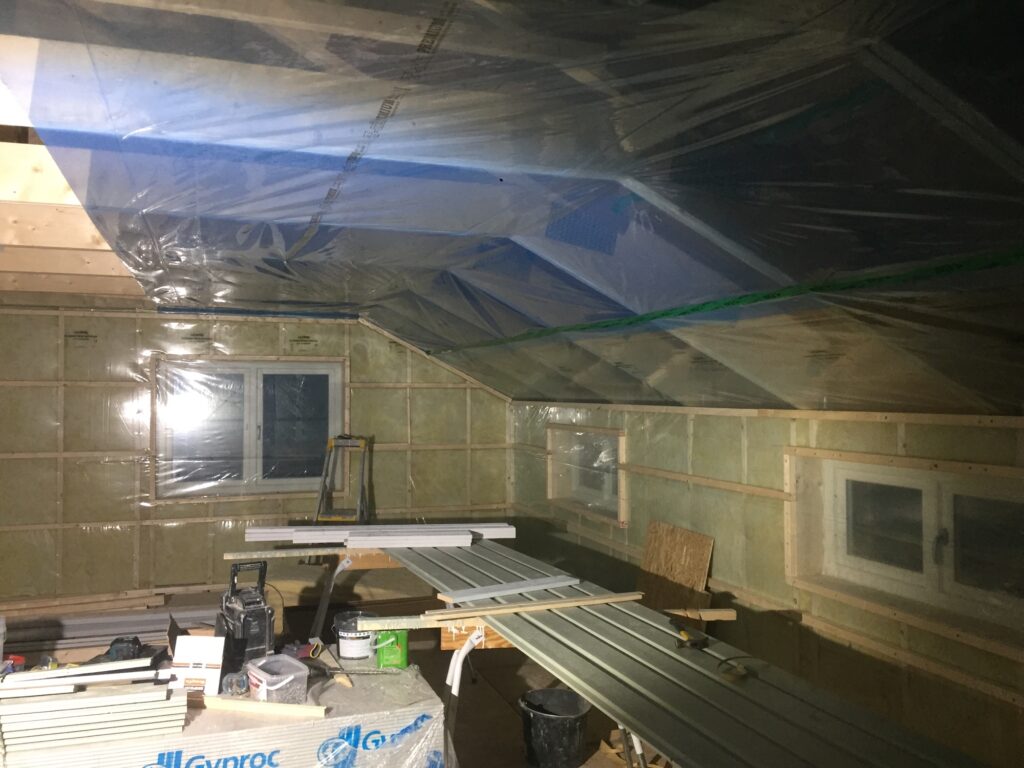 Enligt gängse standard (och konstruktörens ritning) så ska nya våningen ha en ångspärr för fuktig luft. Det görs genom att man plastar in hela våningen. Väggar och tak. Samtidigt så reglades väggarna upp. Lite mer än hälften klart.