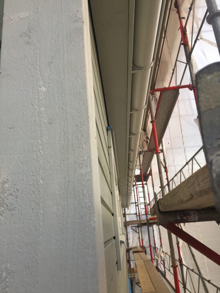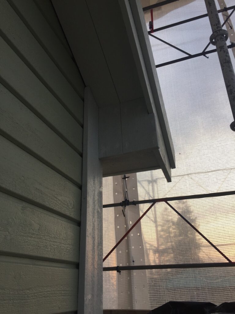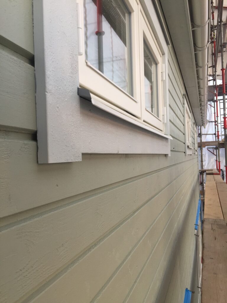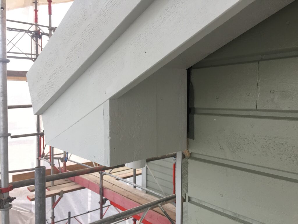 Medan vi målat panel har snickarna fixat med knutbrädor, takfötter och fönsterfoder i den lite gråare färgen och fått upp dem på rätt plats. Nån enstaka bräda kvar nu och några extra tag med penseln så är det också färdgmålat. Om man tänker till och tar brädorna i rätt ordning så blir det smidigare. Tex måla panelen innan man sätter dit en knutbräda så behöver inte knutbrädan tejpas. Vi har lyckas hyfsat bra med detta. På vissa ställen har snickarna redan målat en andra gång så vi bara behövt dra de stora penseldragen.