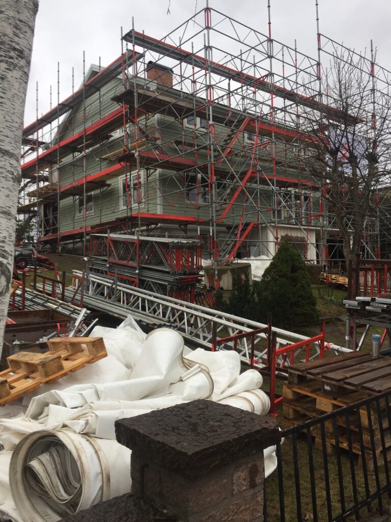 Det händer inte så mycket jättespännande just nu. Vi städar och ställningsgubbarna river ställning. Inget av det går särskilt fort fram. Bortskämda med snickarnas ordningssinne är ställningsgubbarna smått hopplösa. Ställningsdelar nedslängda lite överallt på gräsmattan, väderskydd och ställningar över gångvägar så det inte går att komma fram och inte minst väldigt mkt skräp. Många avskurna blå gummistroppar (som höll fast väderskyddet) överallt i hela gräsmattan, kaffepappmuggar, fimpar och annat skräp. Ogenerat har de lagt upp material hos grannarna utan lov och vi har tjatat varje dag om att det inte är OK. Idag flyttade de iaf på materialet från grannarna, som de hade tänkt låta ligga kvar över påsk. Om skräpet försvinner från vår gräsmatta återstår att se 🙄 Vi har iaf varit noggranna med att städa både ställningarna och tomten från sådant som kan yra iväg i blåsten. Ska bli skönt att få ordning på tomten i nästa vecka.