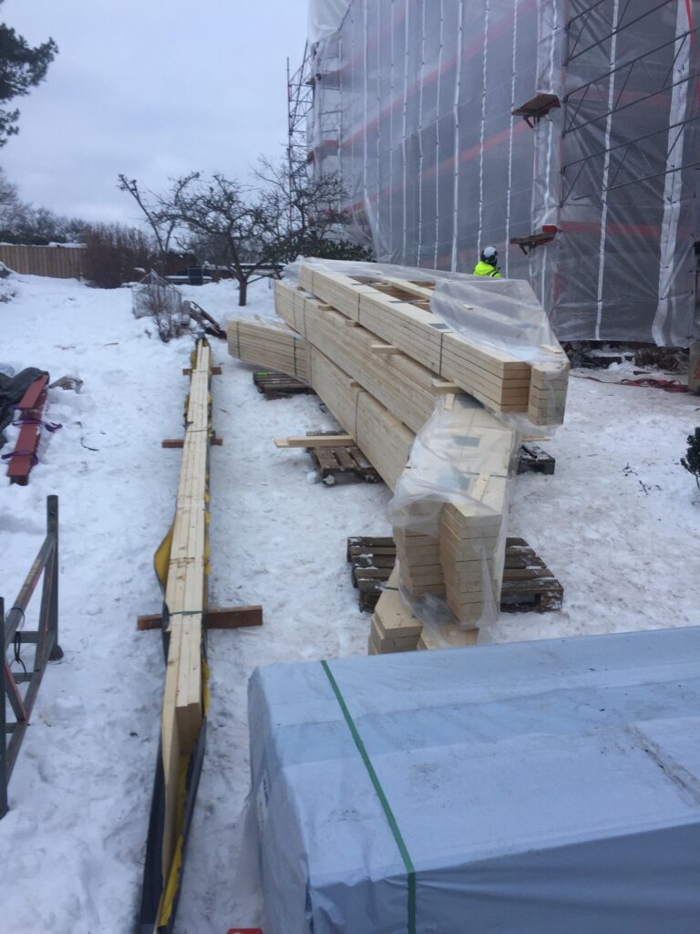 Vi har valt att bygga det mesta i lösvirke som det kallas. Endast takstolar (kostnadseffektivt) och fönster är prefab. Vi kollade på offert på taklyft där allt byggs i moduler i fabrik och sedan monteras på plats under en vecka. Fördelen är att man inte behöver ha huset öppet så länge och det tillverkas i fabrik på annan plats. Men vi såg fler fördelar med lösvirke, där framförallt att vi ville att huset skulle kännas som ett och inte tvådelat. En annan fördel är att vi kan bestämma oss under tiden det byggs, nackdelen är dock att kostnaden är mer löpande än fast. Vi bygger även per timme och inte till fastpris, vilket känns bättre då vi inte behöver ha alla tankar klara innan byggstart och sedan stöka med ÄTA (ändrings- och tilläggsarbeten) gentemot byggarna, men å andra sidan behöver vi ha mer koll på hur arbetet går. Med det sagt så sprängde vi igår 1000h märket!