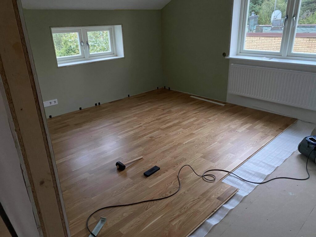 I fredags kom mamma över igen och hon och Johan fortsatte att lägga golv i barnens sovrum. De har lagt nästan hela golvet men vid tröskeln är det en bit som knarrar så det ska snickarna få fixa innan de lägger det sista golvet. Även i allrummet är det ett område som knarrar när man går där.