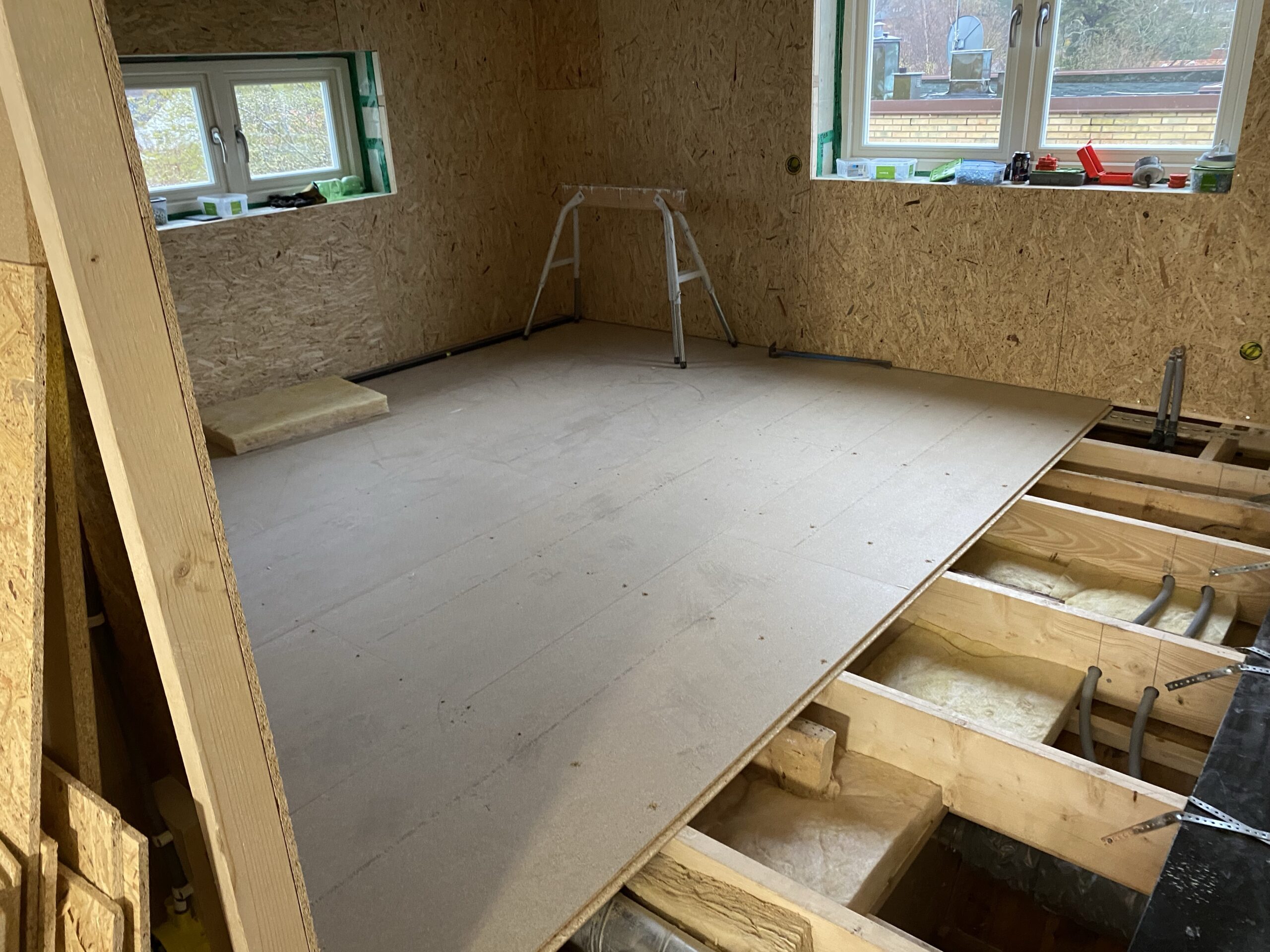 Golvet i allrummet uppe är nu på plats och det går att se var hålet för trappan kommer att bli.