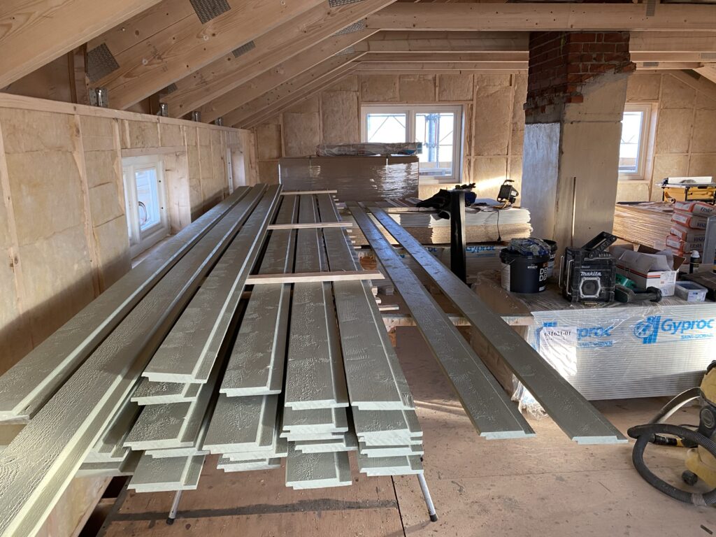 Johan är den som har bäst koll på bygget. Jag sitter mest inne i arbetsrummet och jobbar på dagarna. Idag jobbades det med spikpistol utanför mitt fönster så att mina kollegor bad mig muta. Nordsidans panel är klar och östsidan är på god väg.