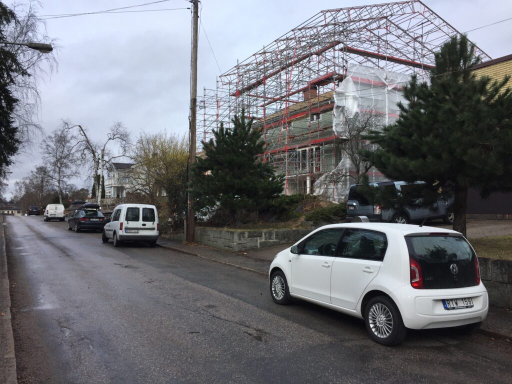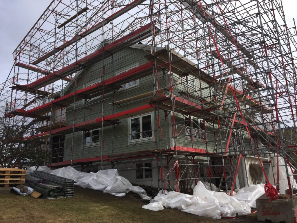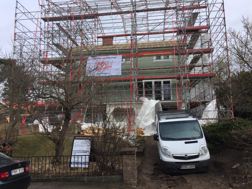För er som sett Extreme home make over vet att det är ögonblicket då husägarna får se sitt hus i nyrenoverat skick. Lite så känns det idag då väderskyddet tas ner. Fast det går inte riktigt så fort som att flytta en buss. Väderskyddet ner idag och förhoppningsvis alla ställningar inom en vecka. Sen är det ju inte helt klart ännu… Spännande är det att få se resultatet!