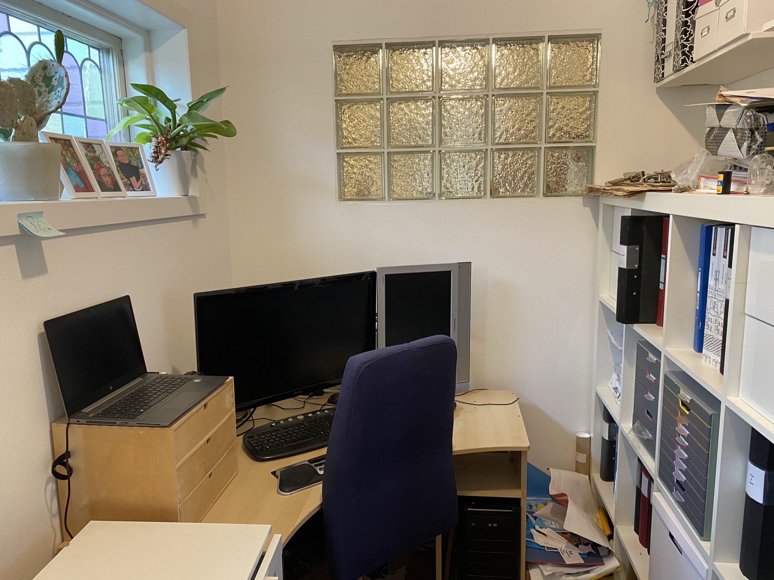 Imorgon är det arbetsdag för mig igen, och dags för ny arbetsplats. Sen jag började jobba efter föräldraledigheten i november har jag suttit i arbetsrummet innanför hallen. Men nu ska väggen snart rivas och det ska dras ventilationsledningar där min dator har stått. Så jag flyttar jag ner i gästrummet.