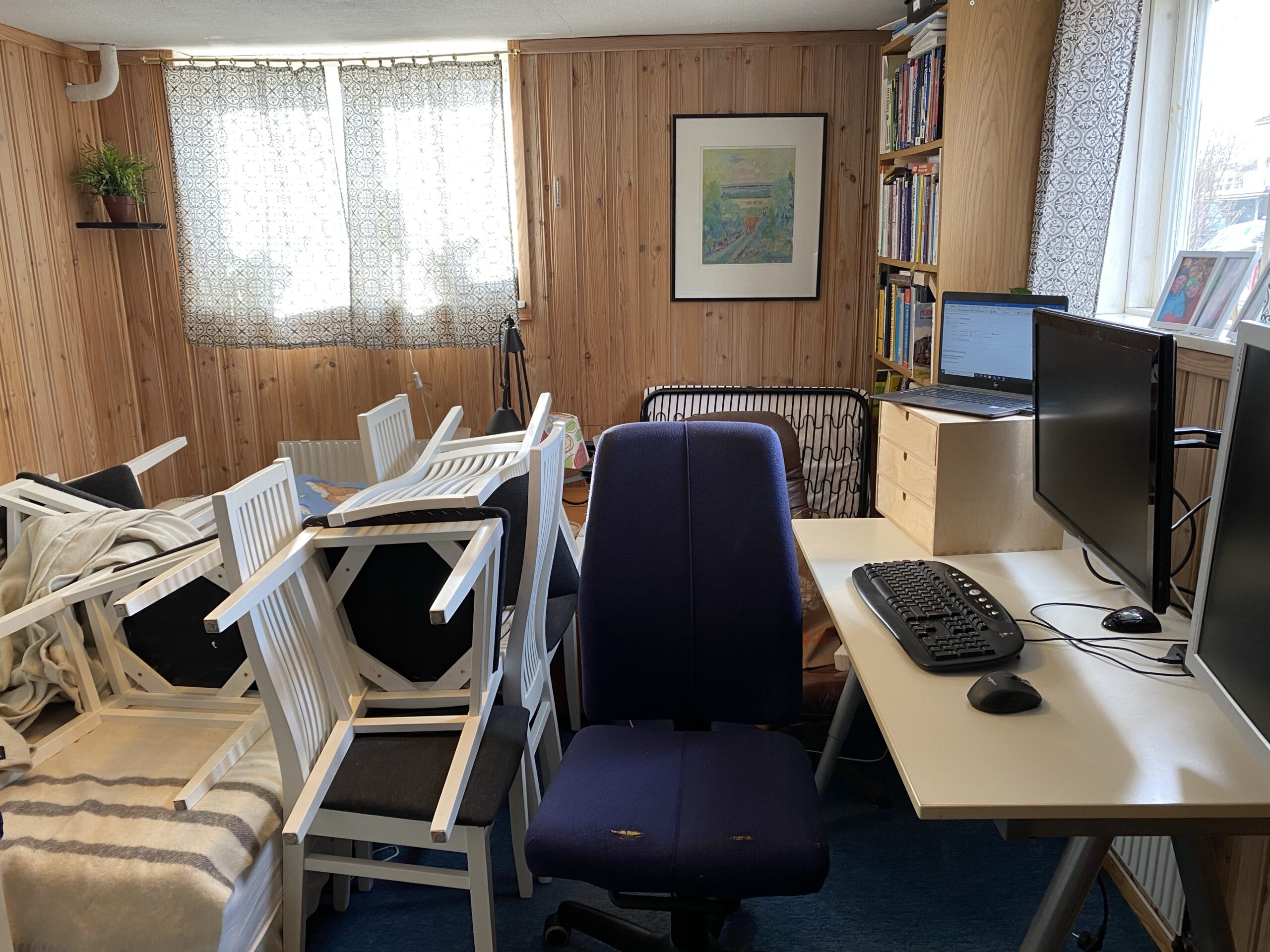 Nya arbetsrummet i gästrummet. Stolarna som hör till stora bordet i vardagsrummet är fina men opraktiska. Ryggarna är för höga för att kunna ställa en uppochner på den andra, så nu ligger de i gästsängen.