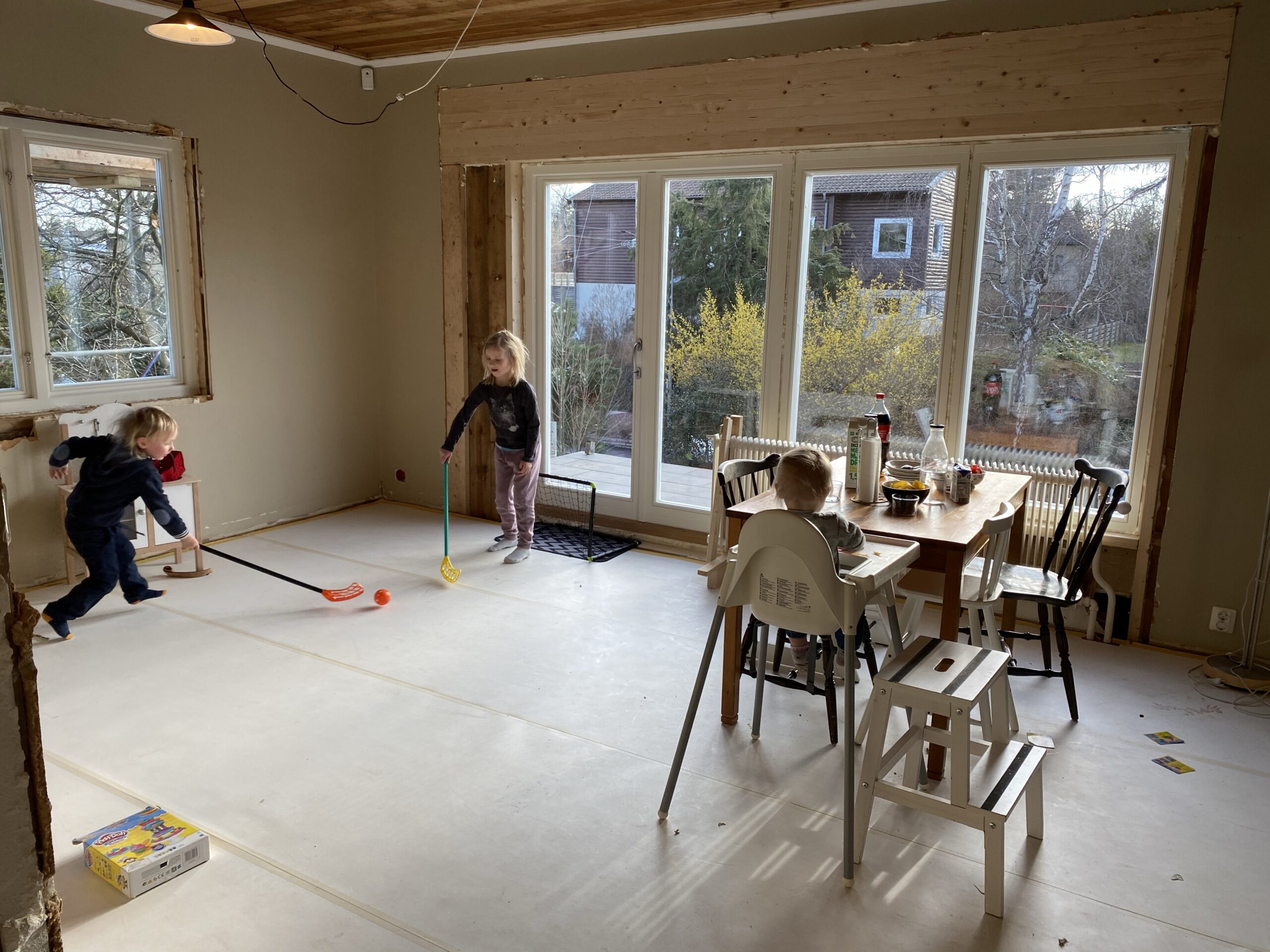 Barnen är också väldigt nöjda med stora öppna ytor att springa på, även om vi blir lite nervösa av innebandyspel nära middagsmat och nya fönster.