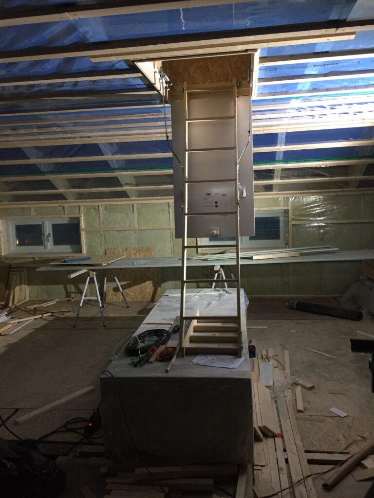 Nu är i princip allt inplastat på nya våningen och vind och boendevåning är avskiljda från varandra. Då vi behöver komma upp medan snickarna är lediga blev det skyndsamt ett besök på bygghandeln igår kväll och en vindstrappa inhandlades. Och idag kom den på plats!