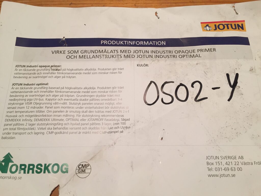 Panelen är grundmålad från fabrik och 5,4m långa men behöver målas två ggr med den färg som vi valt. Hittade nedan beskrivning i samband med leveransen, svensk skog och norsk färg.