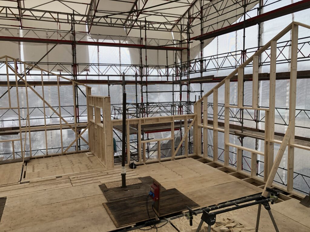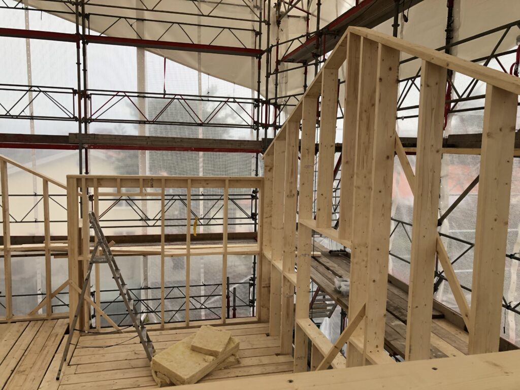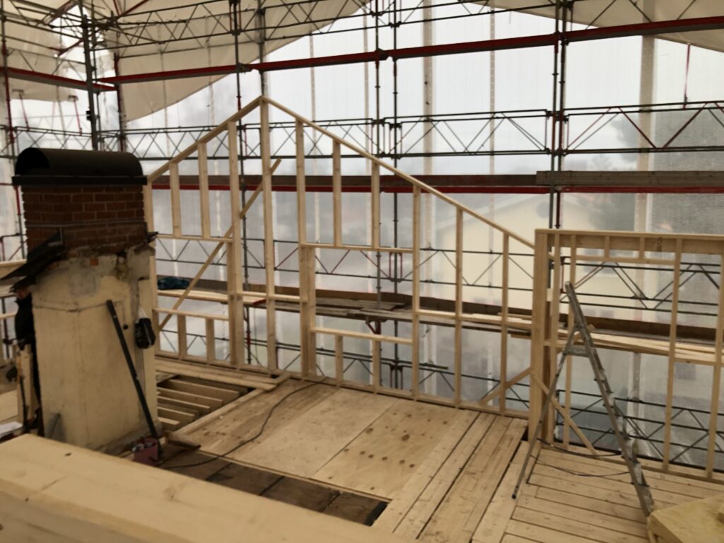 Nord + öst. Det här är fotat ovanför badrumsväggen. Rakt fram kommer det att vara utgång till en liten balkong. Fönstret till höger hamnar mitt i trappan.