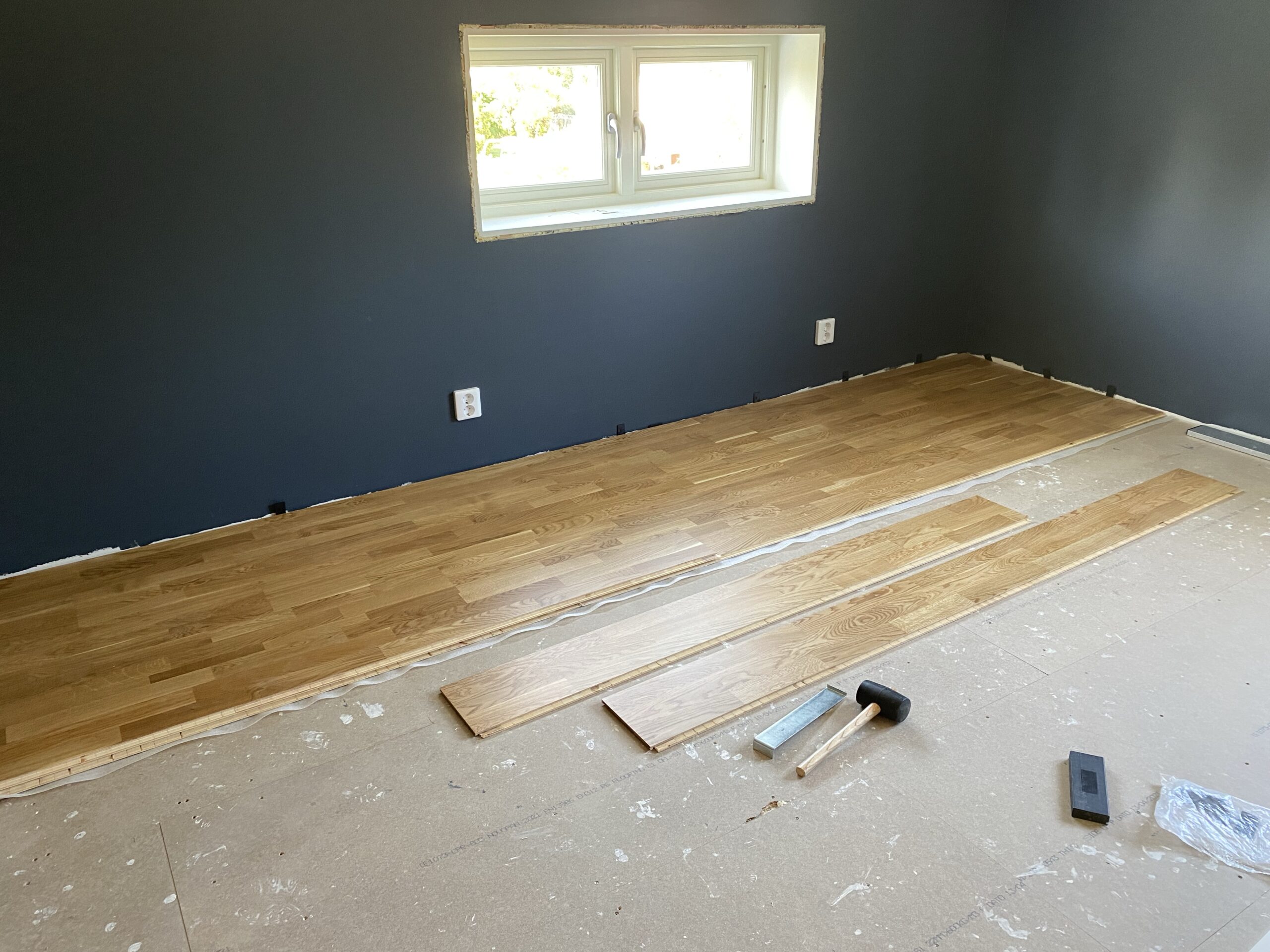Nu är alla rum som ska målas färdiga (fast Johan stödmålar lite var och varannan dag) och vi har satsat på golven. I tisdags kom mamma (som har erfarenhet av flertalet golvläggningar) hit. Jag började med att sprätta bort färg från golvet och dammsuga. Sen skulle vi ta hand om barn och hushåll och vips hade hela dan gått. Klockan var efter 20 när första bitarna lades.