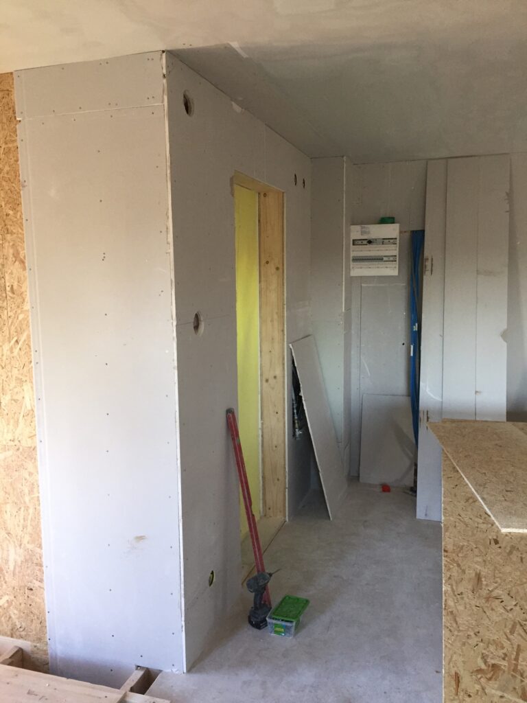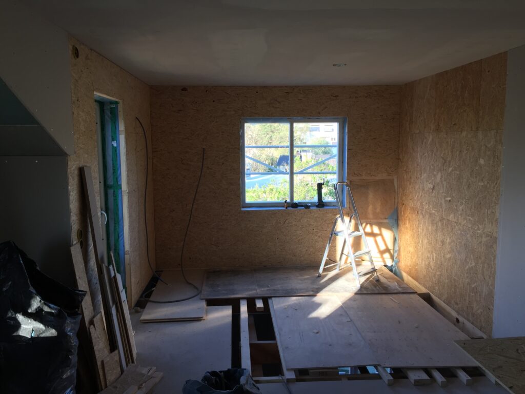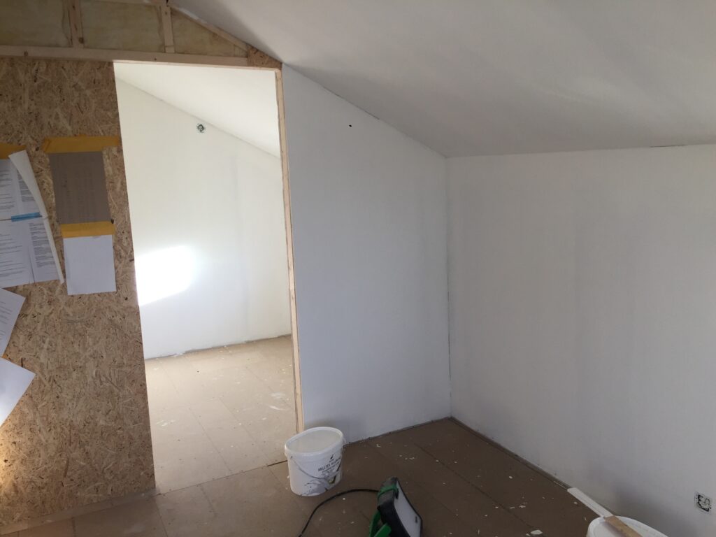 Nu är det bara en liten liten bit spånskiva kvar att sätta på nya våningen. Och inte mkt gips. Garderoben och delar av stora sovrummet är grundmålat.