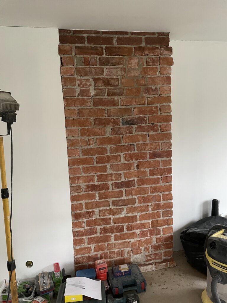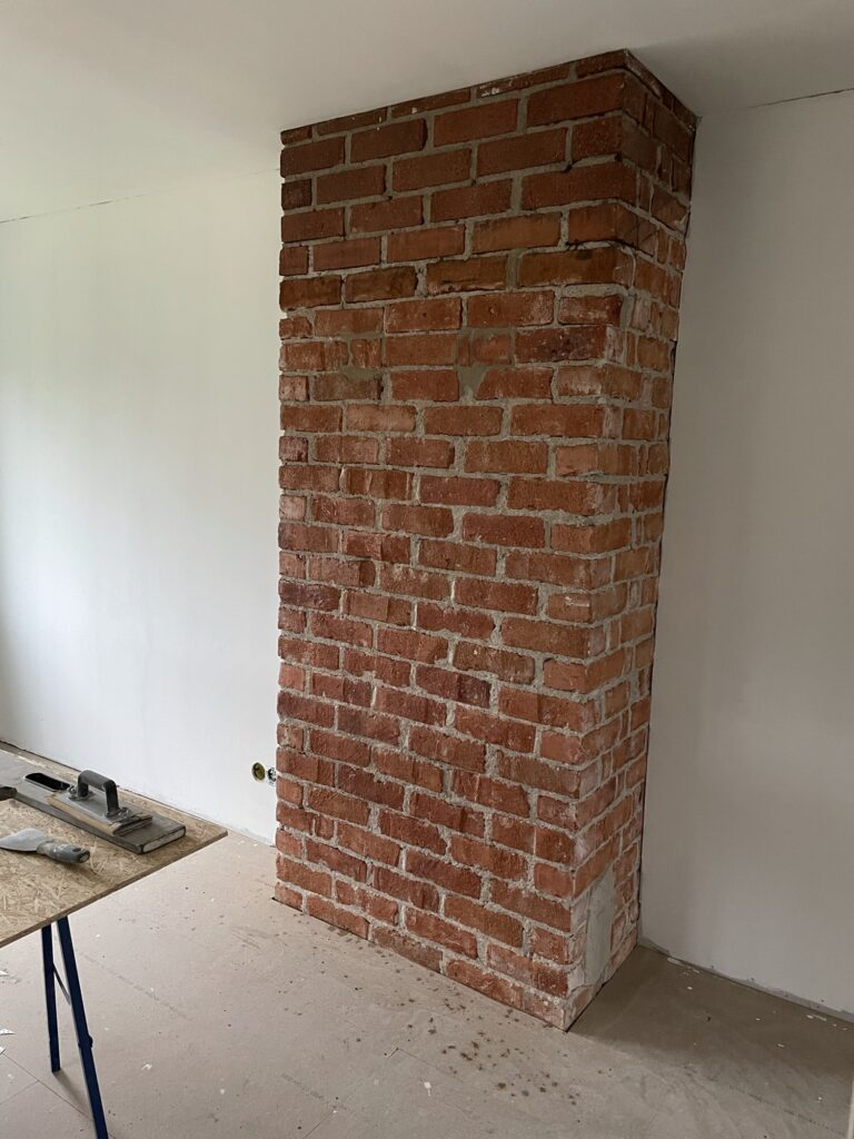 Vi hade först tänkt att putsa skorstenen men tyckte att teglet blev ett trevligt inslag så vi valde att behålla den utan. Snickarna har tidigare petat bort gammal puts, lagat håligheter och sedan skrapat den med stålborste. Ni har det också målats den med primer för att hålla dammet på plats.